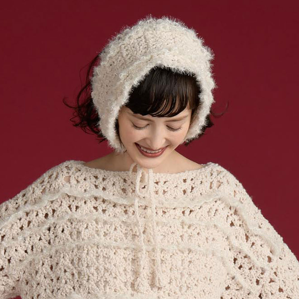 キラキラ光るファンシーヤーンをネット編みでフリルのように編み入れた、可愛いプルオーバー&バブーシュカのセット。バブーシュカは首に巻いてもチャーミング ♡