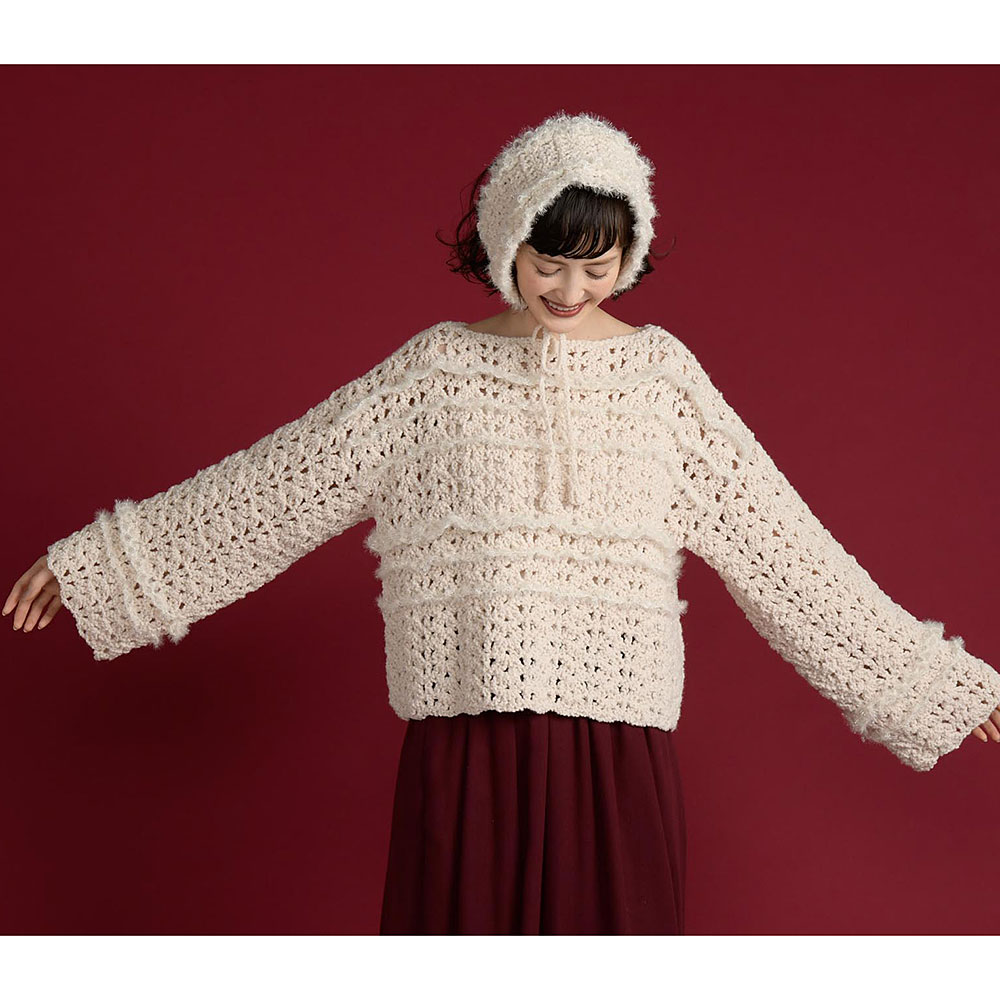 キラキラ光るファンシーヤーンをネット編みでフリルのように編み入れた、可愛いプルオーバー&バブーシュカのセット。身頃も袖もかぎ針でまっすぐに編むプルオーバーは、パーツをつなげたらできあがり!の楽々仕上げのデザインです。バブーシュカは首に巻いてもチャーミング ♡