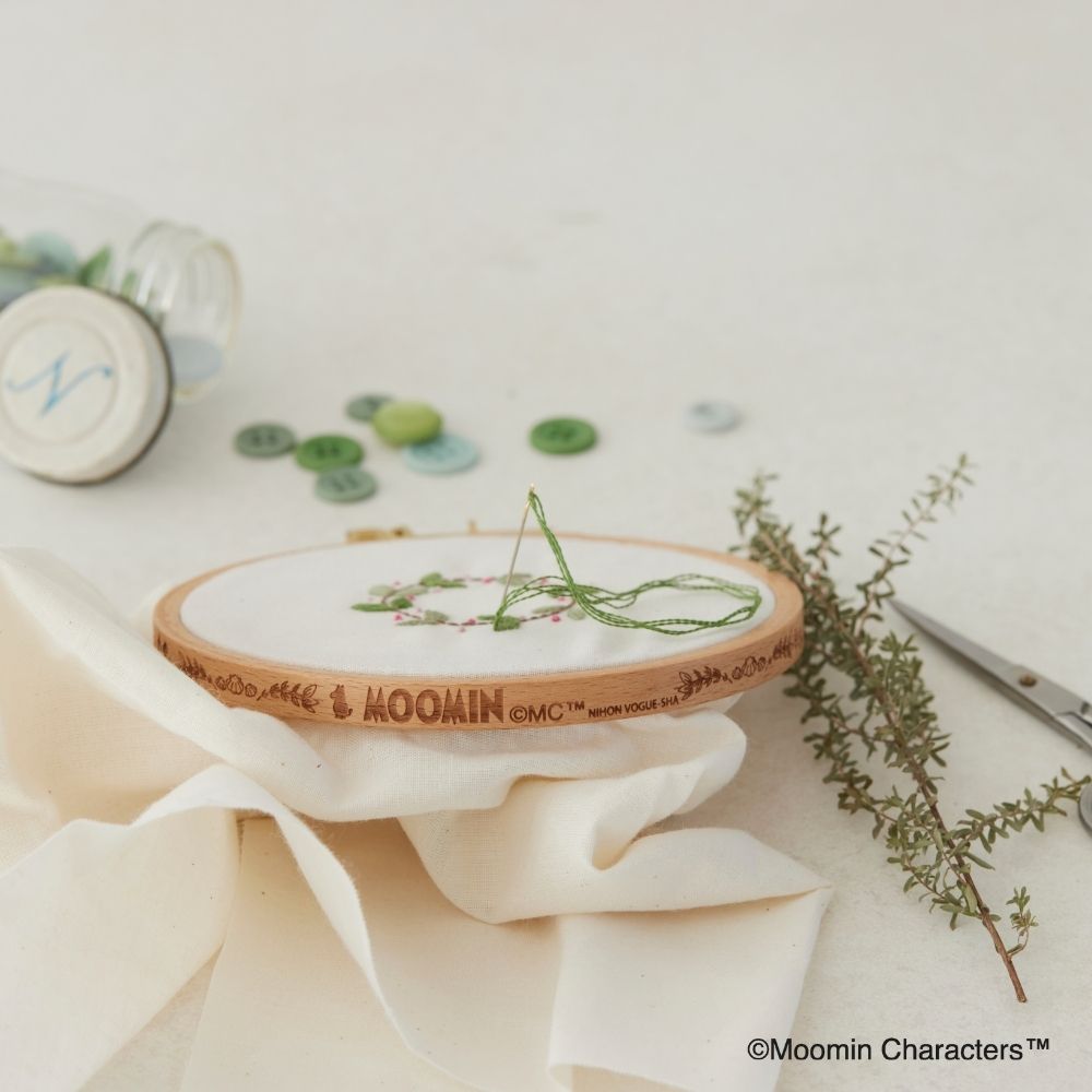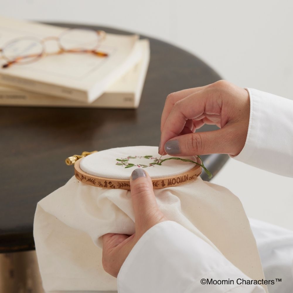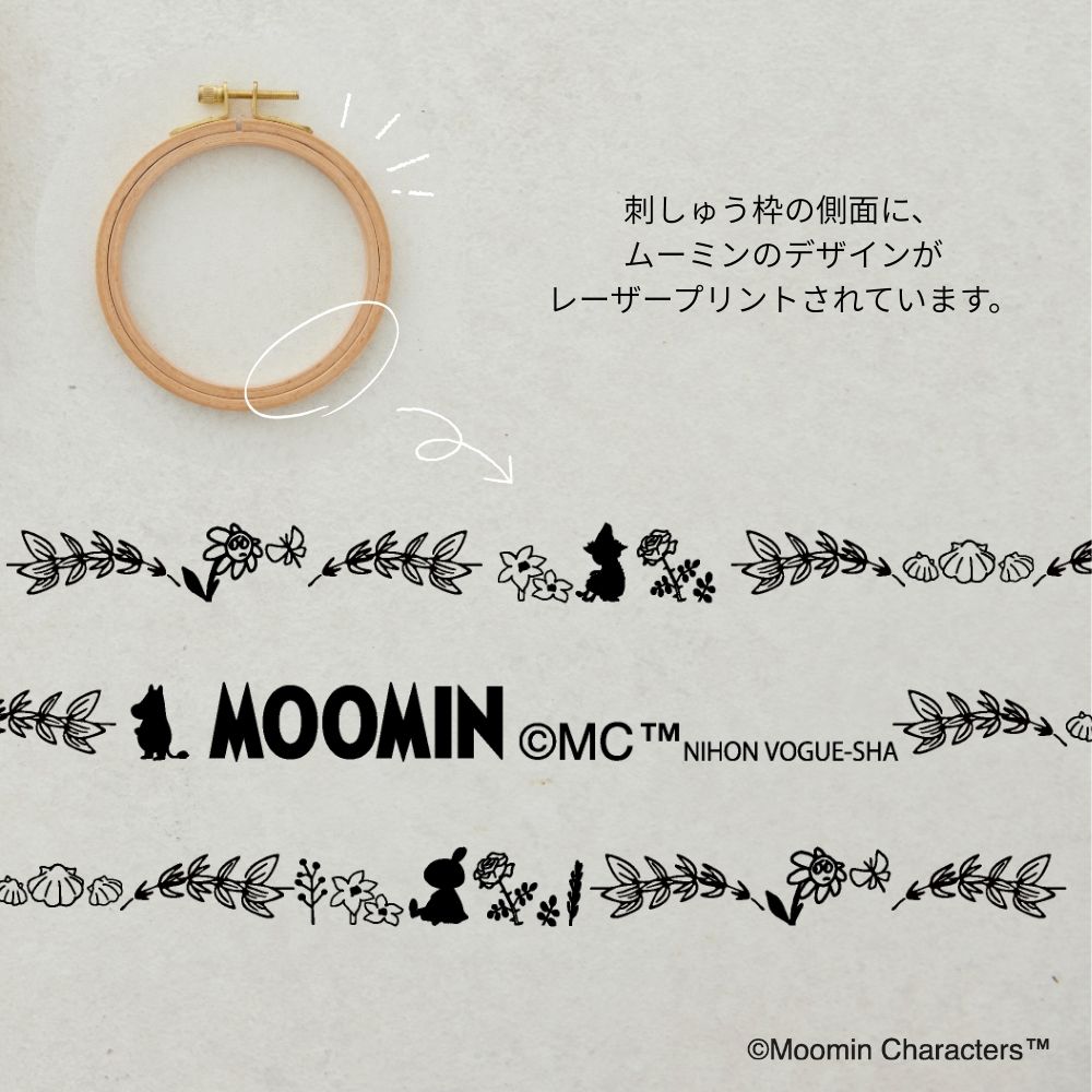 刺しゅう枠の側面に、ムーミントロール・リトルミイ・スナフキンのシルエットと、ボタニカルなイラストがプリントされています。