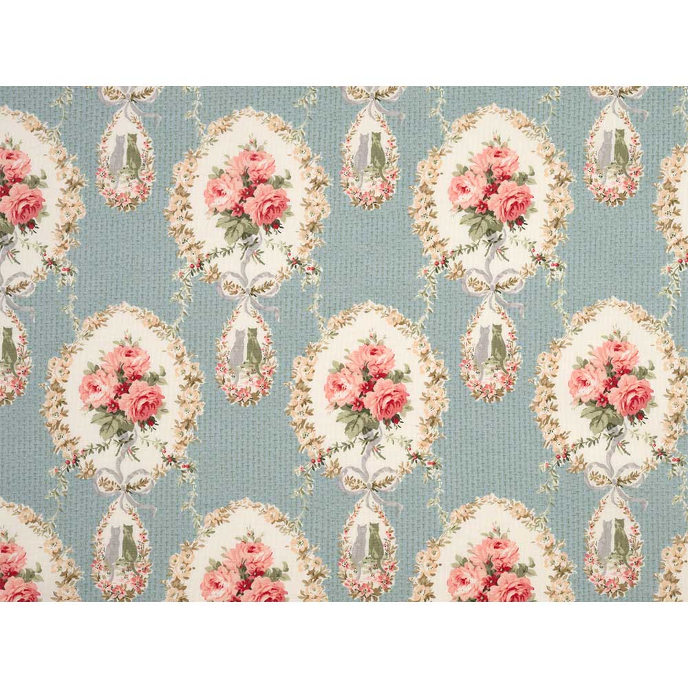 地模様の入ったライトブルー地に、フラワーブーケのフレームと猫のシルエットを描いた、フレンチカントリーのような優しいデザインです。バッグやインテリアなどにも。