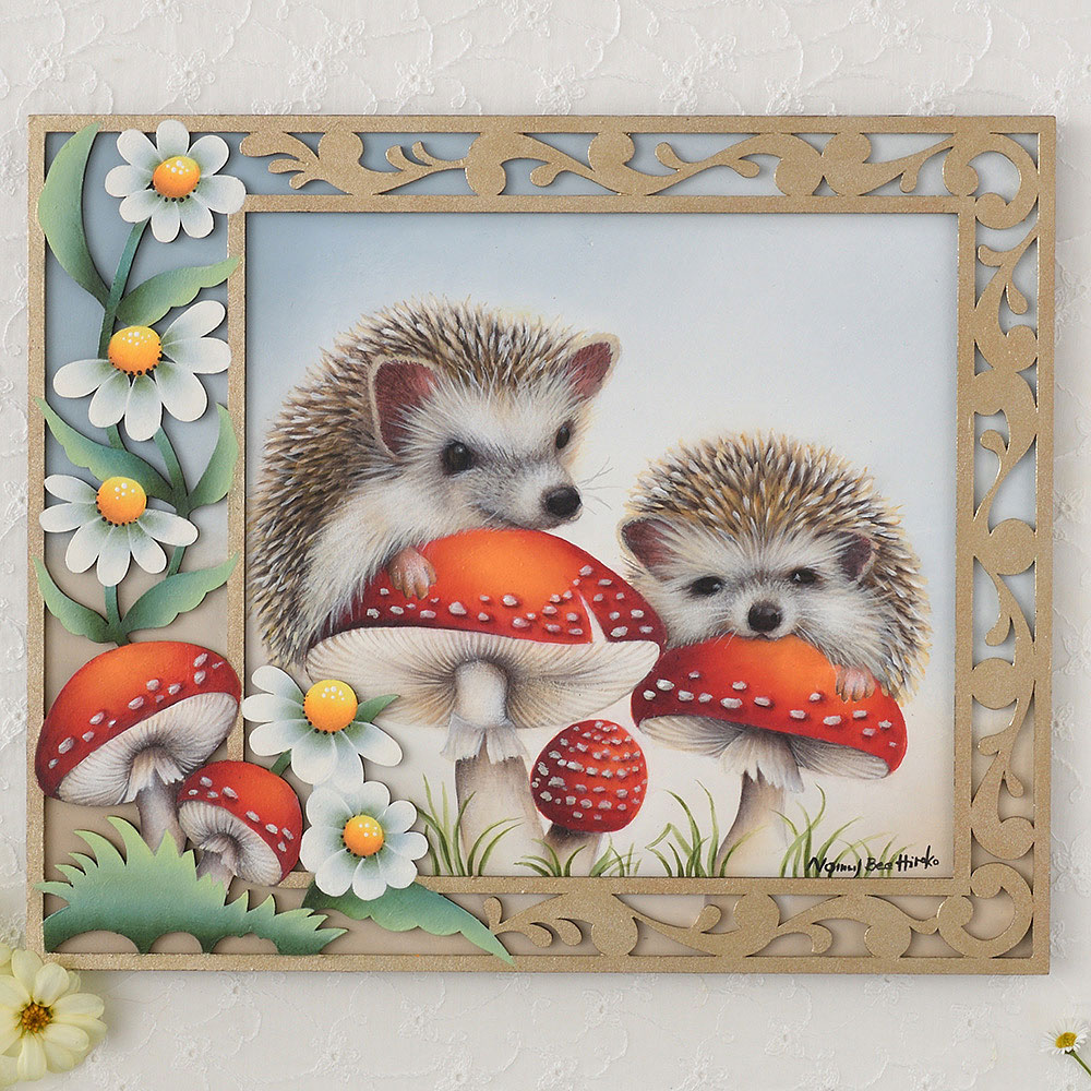 ツンツンした針が生えたまるい背中、やわらかいお腹、笑顔のような表情など、ハリネズミのかわいさが詰まっています。 グラデーションになった針、お腹側のやわらかい毛並み、シェイドやハイライトを何層を重ねて質感を出す描き方を、動画でしっかりと解説。ハリネズミも、ベニテングダケも幸運を呼ぶとされて親しまれているモチーフです。レースのようなフレームは、図案を写さずにぬり絵感覚で描けます。ボードと、レースのようなフレームは別仕立てで、それぞれ描いた後で貼り合わせます。フレームはぬり絵のように塗り分けても、1色だけで塗るのもかわいいですね。飾る場所やお好みに合わせてアレンジをお楽しみください。監修:のむらひろこ