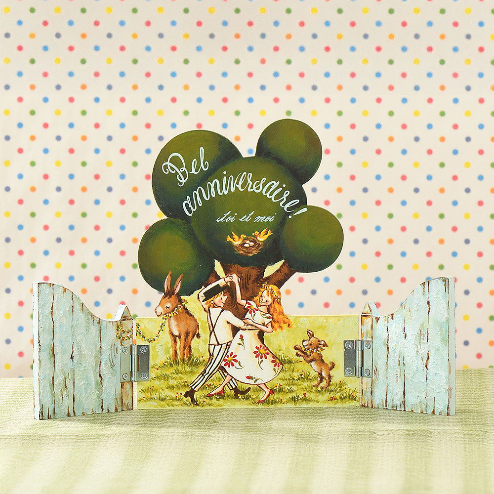 結婚記念日や誕生日など、おめでたいことにぴったりな作品! ポップアップカードをイメージしてデザインされた素材なので、プレゼントに添えて贈ってもすてきです。文字もアレンジして、好きに描いてもOK! 喜びあふれて、踊り出したシーンを描いています。監修:エレナ・エ・ルポン 仁保喜恵子