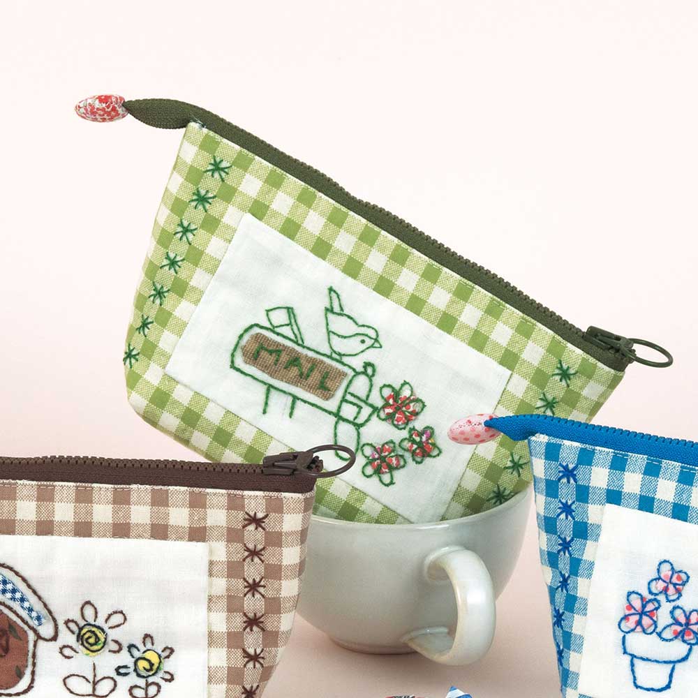 【キット作り方つき】チェックのベースに、それぞれアップリケと刺しゅうの可愛い柄をデザインしたポーチ4色です。仕立てが簡単なフリースタイルファスナーを使用します。
