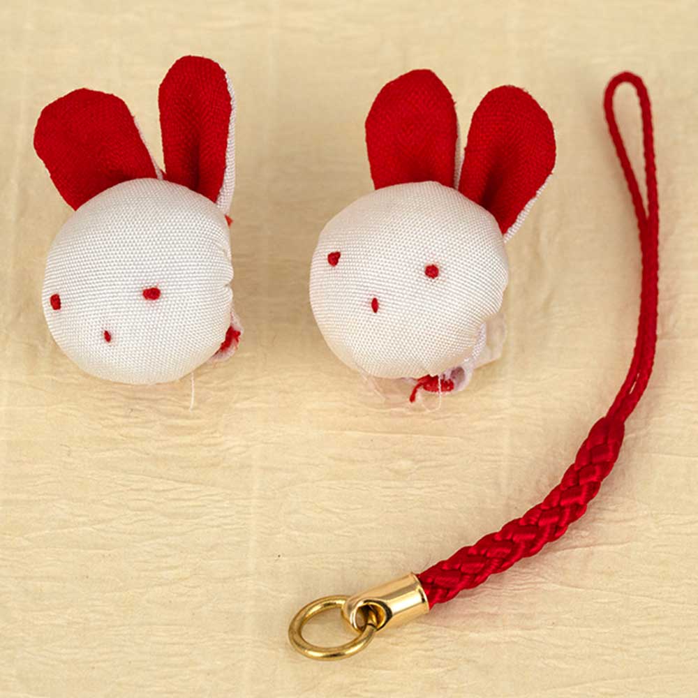 表布・裏布(古裂)、小花パーツ、発泡スチロールパーツ半球、つめ綿、うさぎの頭パーツ2個、ストラップひも1本