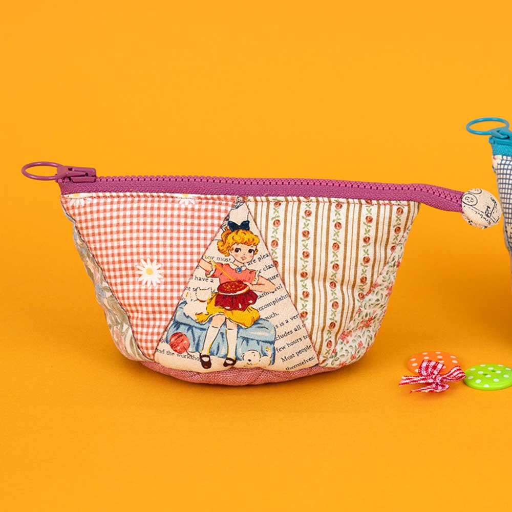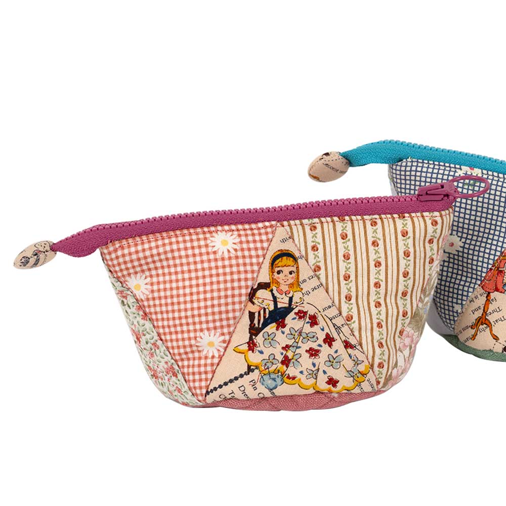 【キット作り方つき】キルトや刺しゅうを楽しむ、レトロガーリーな女の子たちの柄布を中心にピースワーク。収納力のある丸底ポーチ2色です。取りつけが簡単なフリースタイルファスナーを使用します。
