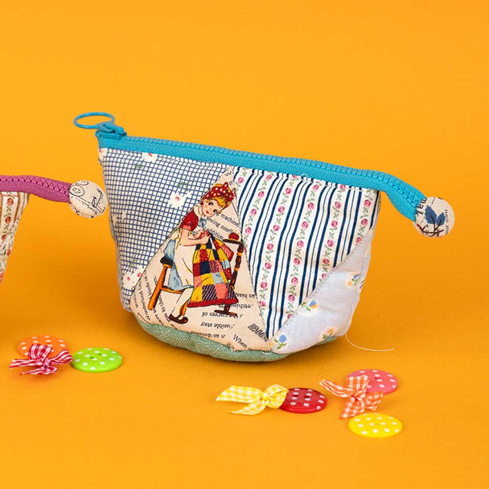 【キット作り方つき】キルトや刺しゅうを楽しむ、レトロガーリーな女の子たちの柄布を中心にピースワーク。収納力のある丸底ポーチ2色です。取りつけが簡単なフリースタイルファスナーを使用します。