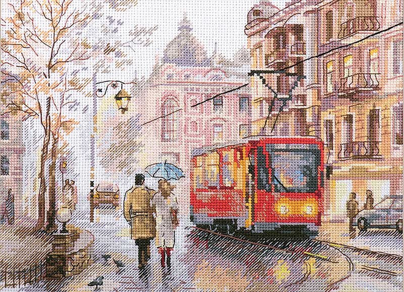 【キット作り方つき】秋雨の降る街並みを描いた、哀愁感の漂うクロスステッチ作品。ハーフクロスステッチで雨脚の強さを表現しています。中級の方向き。