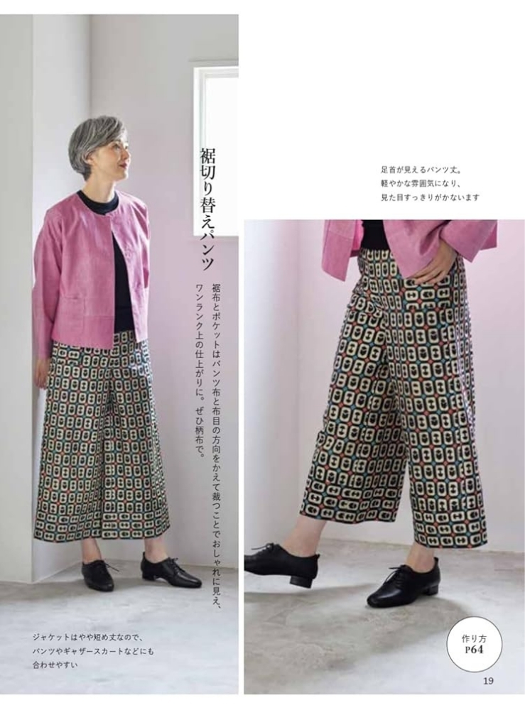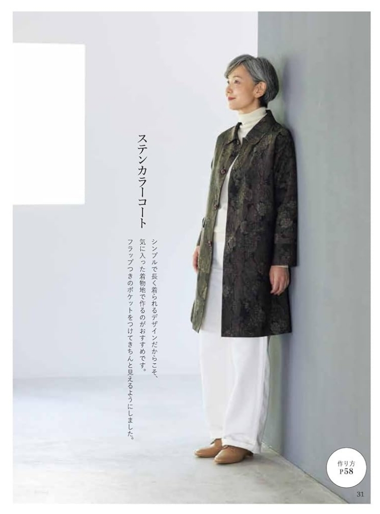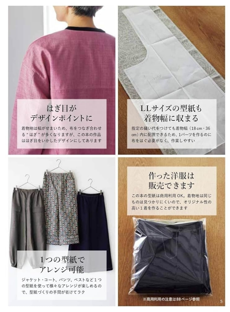 50代以降の女性の体型を元に作られた、着心地よし、デザインよしの実物大型紙で、着物リメイクを楽しむ1冊。着物のほどき方から扱い方などくわしく丁寧に解説をしているので、着物リメイクがはじめての方でもきっと楽しめます。型紙はすべて着物幅で収まるように考えられているため、型紙を作ったら置いて裁つだけ。また、縫い合わせる位置も考えられており、縫ったはぎ目がデザインポイントになるようになっています。ボタンホールなし、ファスナーなし、後ろあきなし、の3ナシ仕上げ。商用利用OKなので作った洋服を販売することも可能。S・M・L・LL(一部フリーサイズ)の実物大型紙つきです。