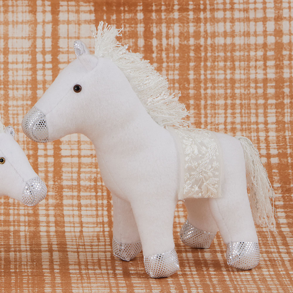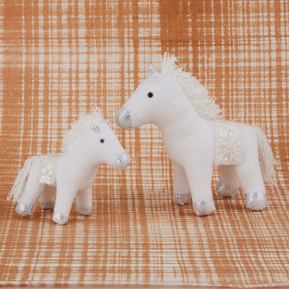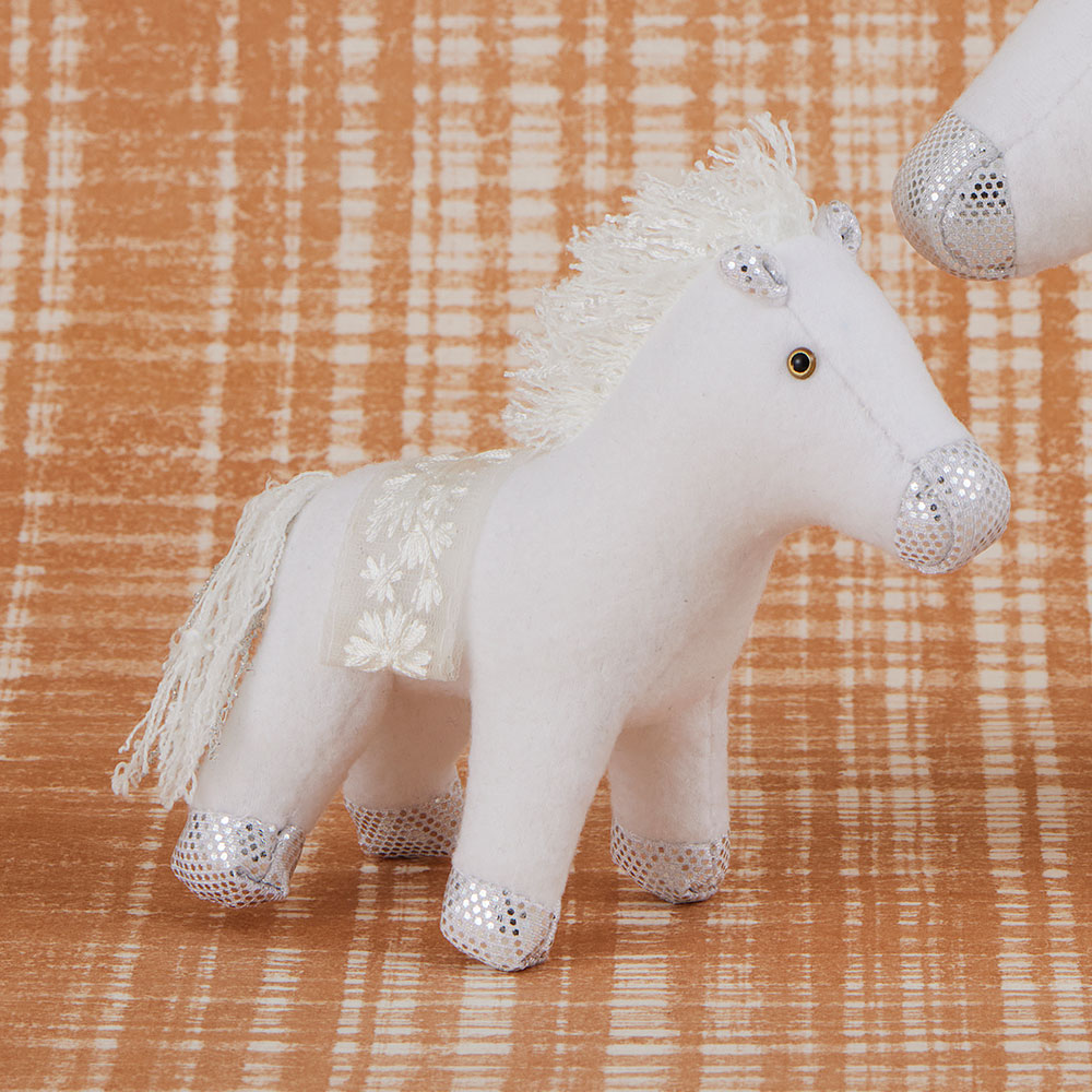 【キット作り方つき】【キット作り方つき】可愛い白馬の親子です。本体の白いフリースとメタリック調の布はストレッチ素材なので、ほつれもなく作りやすいです。鞍部分はレースを飾ります。