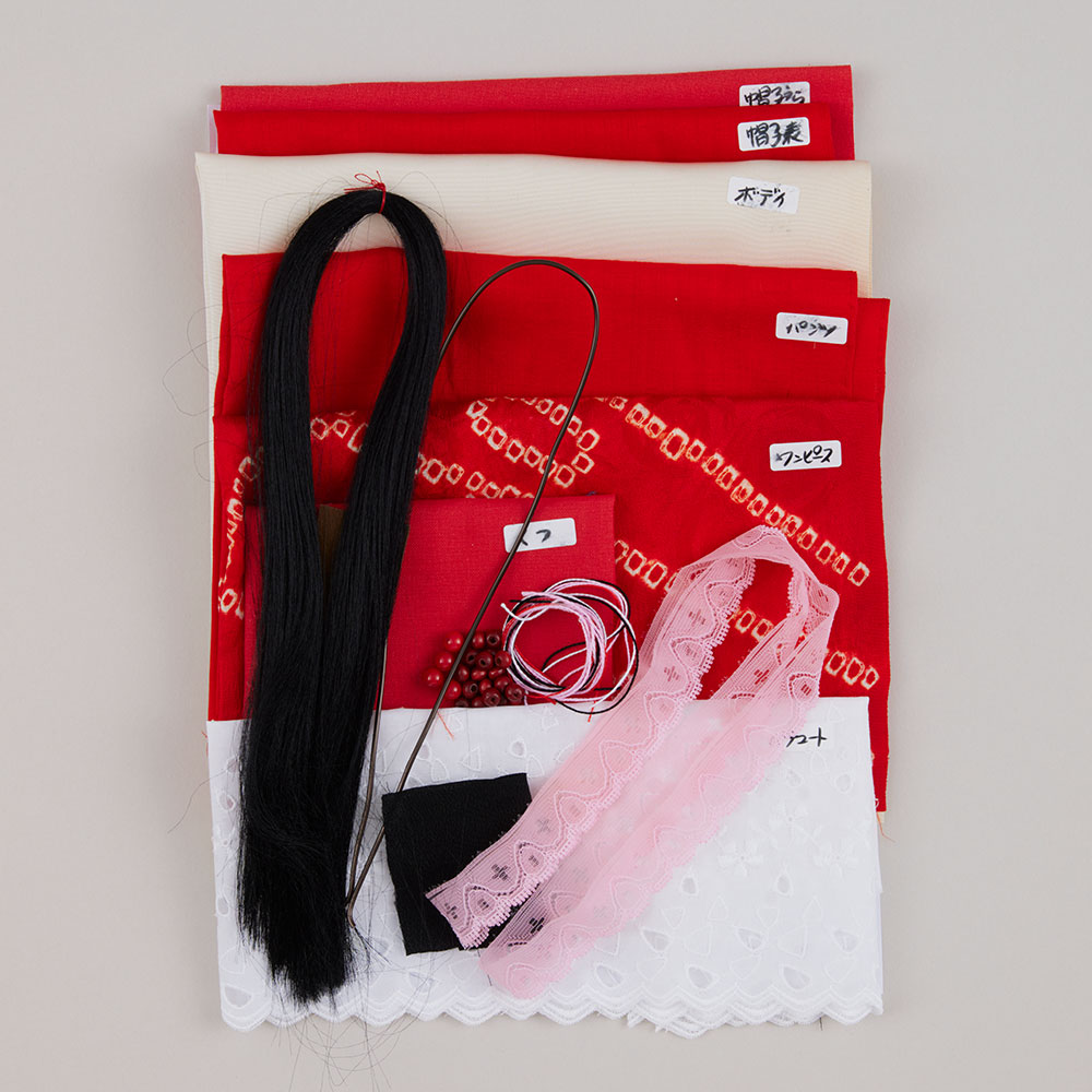 本体布(古裂)、レース、お人形用髪の毛、ビーズ、山珊瑚ビーズ、ステッチ用糸、ワイヤー