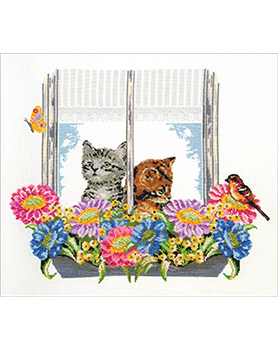 【キット作り方つき】 好奇心いっぱいにチョウや小鳥と遊ぶ子ネコの表情が可愛らしいクロスステッチ作品です。毛並みや花の微妙な色合いを表現する楽しみを。中級の方へ。