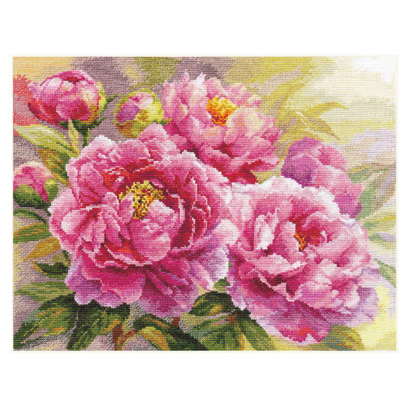 【キット作り方つき】花びら1枚1枚まで繊細に表現し、シャクヤクを鮮烈な印象で描いたクロスステッチ作品。中級の方向きです。