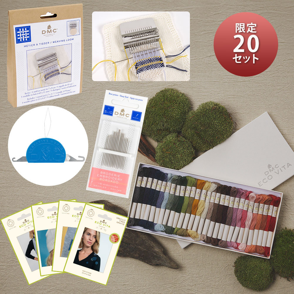[限定20]フランスの刺老舗しゅうメーカー・DMC社製のオーガニックのメリノウールを使用した「エコヴィータ ウールスレッド」30色と、ミニサイズのダーニング織り機「ミニ ウィービングルーム」、エコヴィータ用刺しゅう・ウィービング図案、糸通し器、エンブロイダリー針セットを入れた合計税込13,000円相当のスペシャルセットを特別価格でお届けします。農薬などの化学薬品にさらされていない牧草地で育った羊から刈り取った羊毛を使用し、天然染料で染めた環境にも優しいウール糸です。25番糸3本取り程度の太さで、撚り分けずそのまま刺します。クロスステッチはもちろん、フランス刺しゅうやパンチニードルなどにもおすすめのウール刺しゅう糸です。。