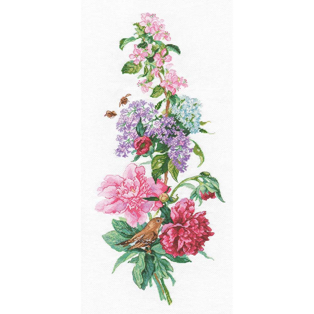 赤やピンクのピオニーなど、華やかな花々をアレンジメントしたデザインのクロスステッチ作品です。上級の方向き。ロシア・OBEN社製。