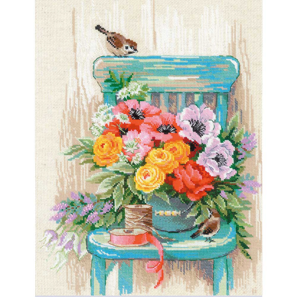 【キット作り方つき】 椅子に飾ったカラフルなフラワーブーケを描いた華やかなクロスステッチ作品です。上級の方向け。リトアニア・RIOLIS社製。