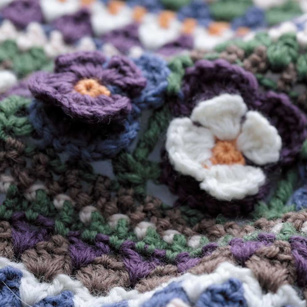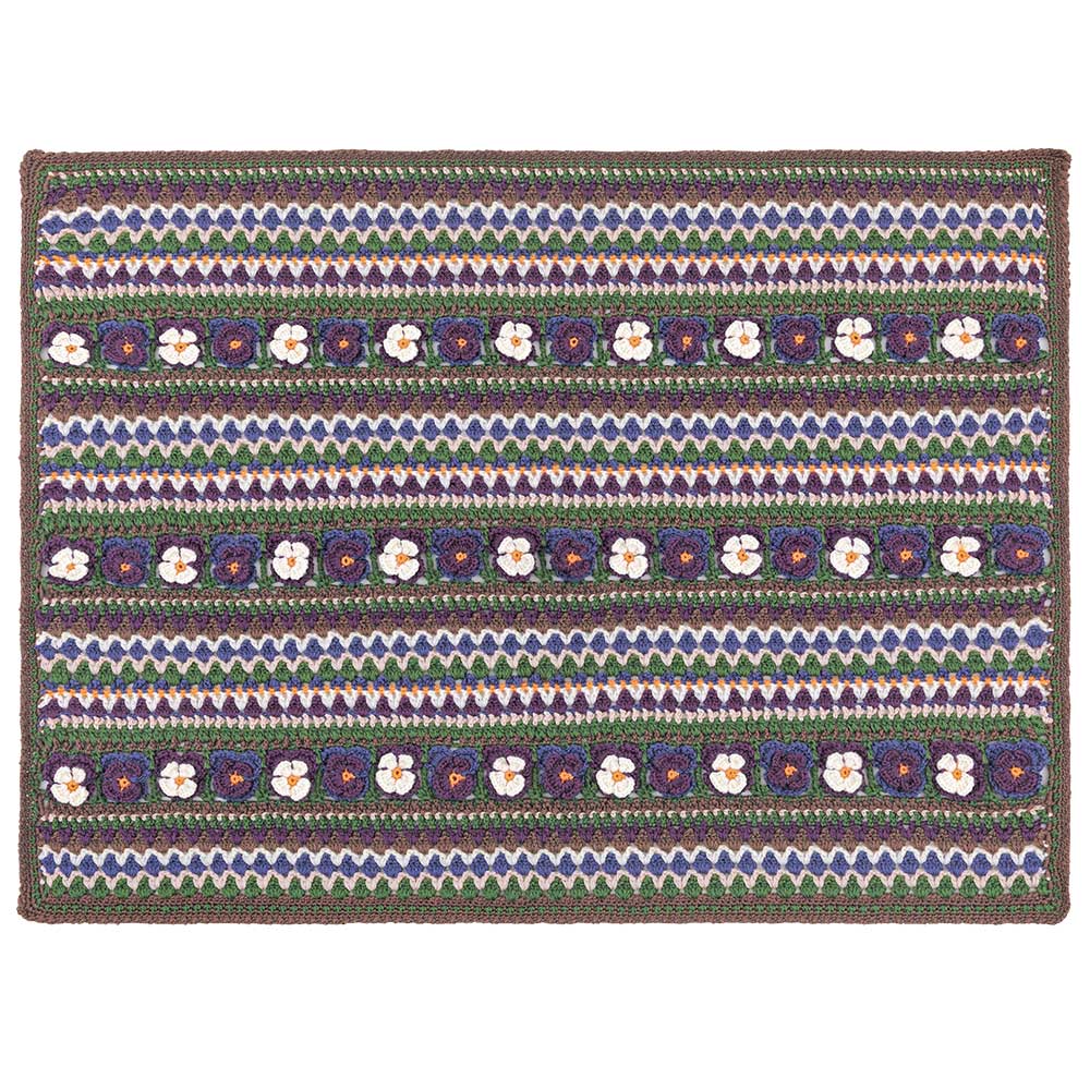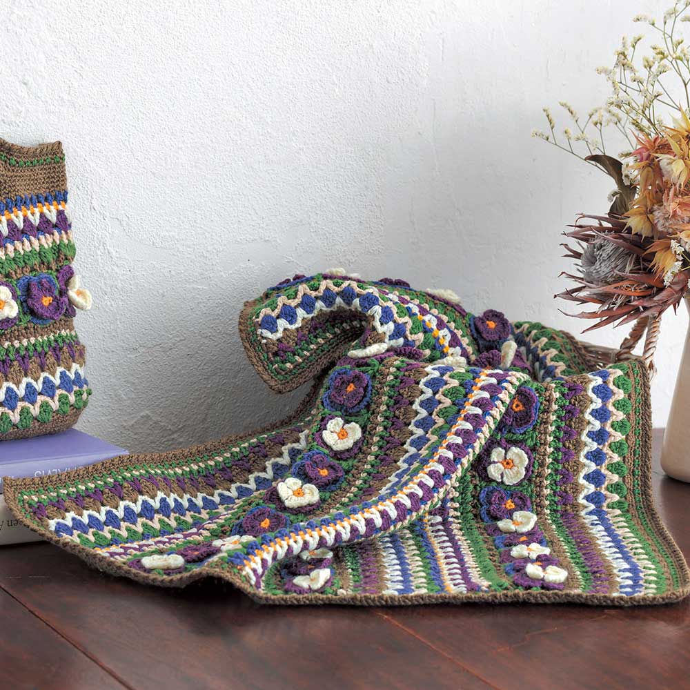 【キット作り方つき】大人気のビオラのモチーフを編みつなぎ、ボーダー模様と合わせて仕上げるバッグと、同シリーズのブランケットです。バッグは中袋つきで伸びにくい仕立て。ブランケットはひざ掛けにもなるサイズ。どちらも中級以上の方にお勧めします。
