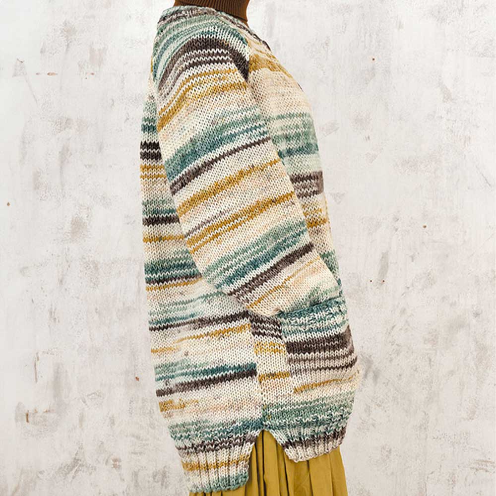 【キット作り方つき】カラフルでカジュアルな雰囲気が魅力のプリントヤーンで編むユニセックスのカーディガンです。極太糸でザクザクとテンポよく編めるのも嬉しいポイント。シンプルなメリヤス編みだけですが、グラデーションが自然に浮かび上がり、まるで凝った模様のような仕上がりに。ポケット付きのデザインで実用性もあり、日常使いにぴったりです。男女兼用タイプなので、パートナーとシェアしたり、プレゼントにも喜ばれます。中級。