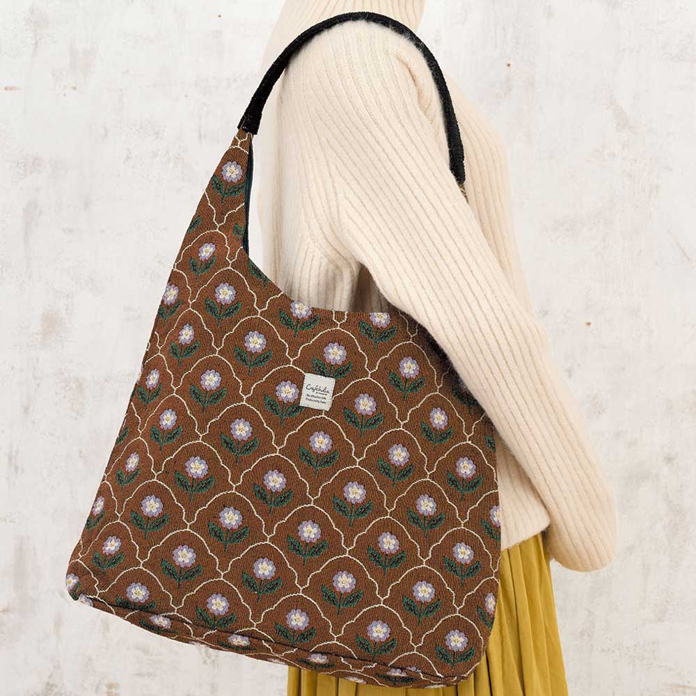 ●完成品●厚手でしっかりとした、上品な生地感が魅力のジャカード地のショルダートートバッグ。肩から掛けやすいワンハンドルなのでカジュアルすぎず、きちんとした場で持っても素敵です。小花柄がかわいらしく、落ち着いた印象に。裏地もついていて、入れ口はマグネットボタン、背面には大き目のファスナーポケット付きで使いやすい。