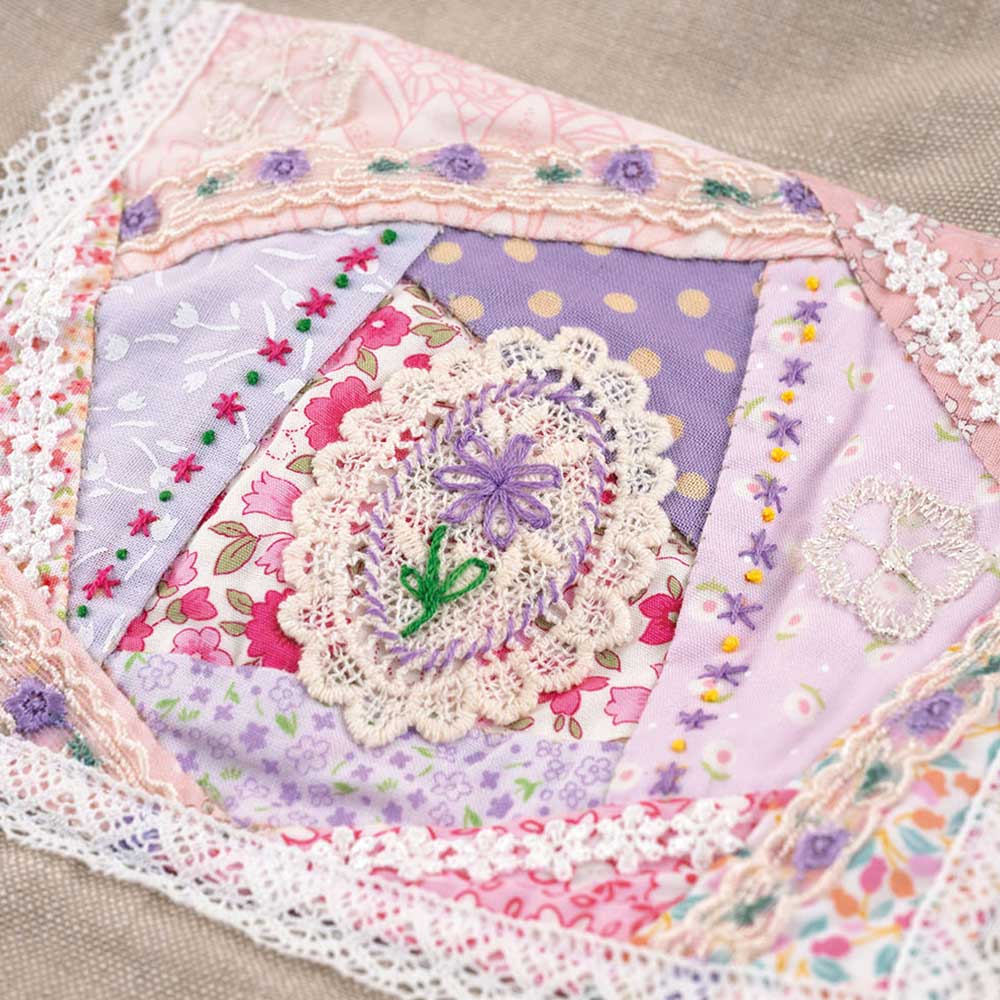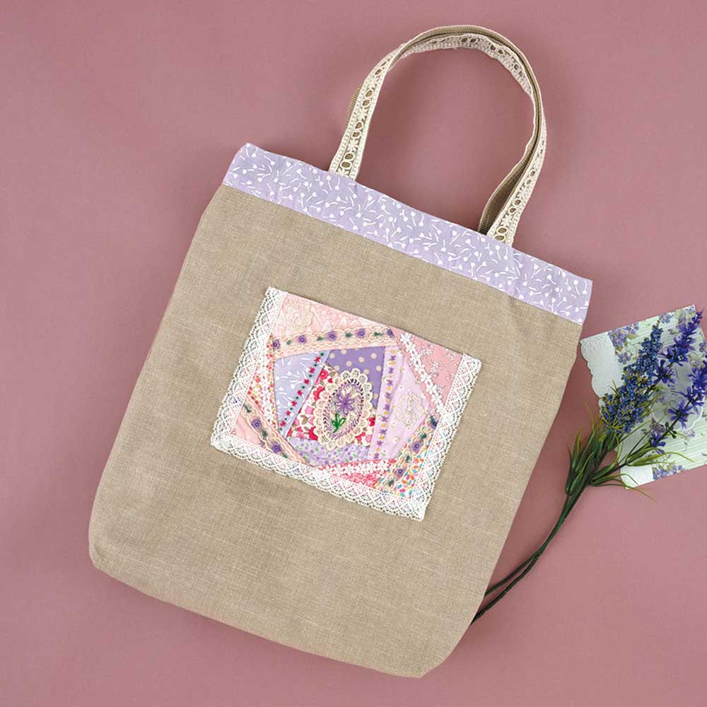 【キット作り方つき】紫系のクレイジーキルトのポケットがポイントのフラットバッグです。A4 判が入る便利なサイズで、キルト芯不使用なのでコンパクトに畳めます。後ろは1枚布。たっぷりのレースや刺しゅうで飾って仕上げます。