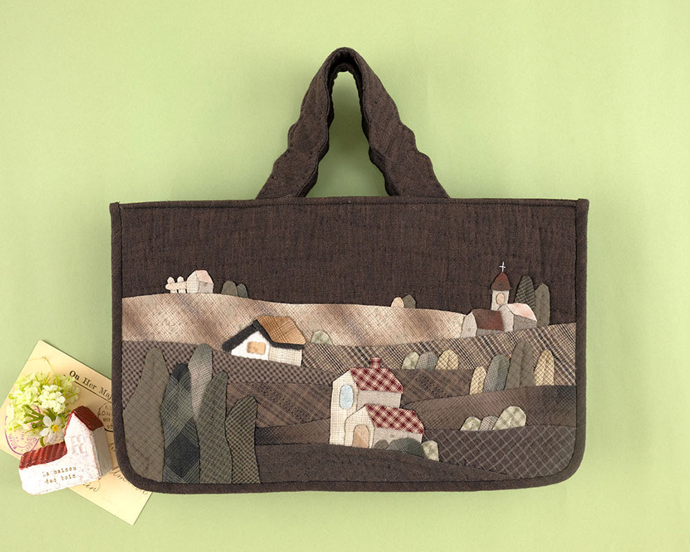 【キット作り方つき】ノスタルジックな山の上の街並みをアップリケした手さげです。書類や端末なども入る便利なサイズ。後ろは1枚布で仕立てます。