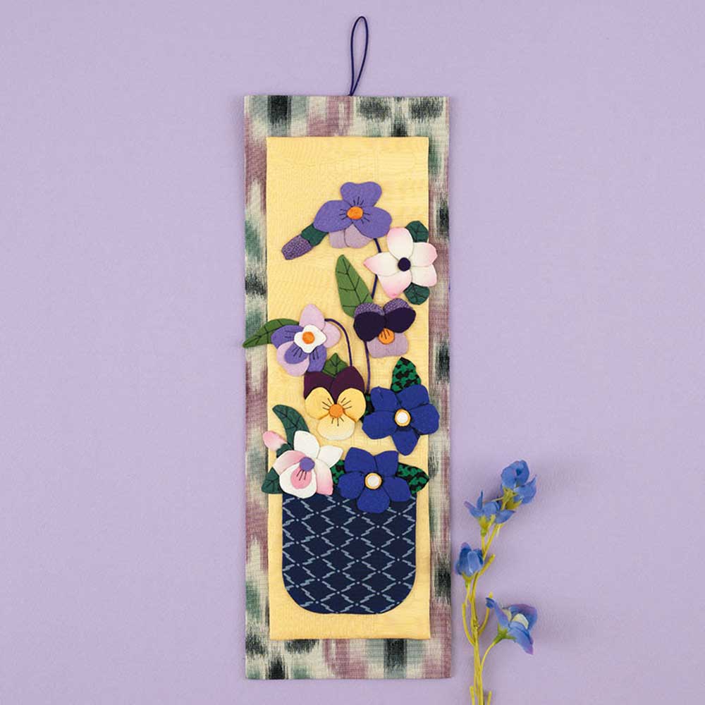 【キット作り方つき】【古裂】花器に入った様々な色のパンジーを押絵で表現。ちょっとしたスペースに飾れるサイズです。土台にも厚紙を入れるので、壁に立て掛けても飾れます。