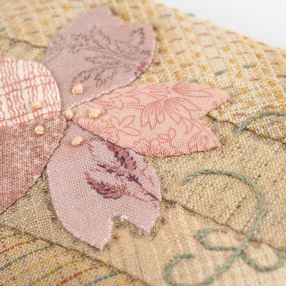 【キット作り方つき】ピースワークのベースに桜をアップリケしたミニポーチ。ころんとした形とマチなしの2個が作れます。どちらも後ろ側はアップリケや刺しゅうなしのデザインです。