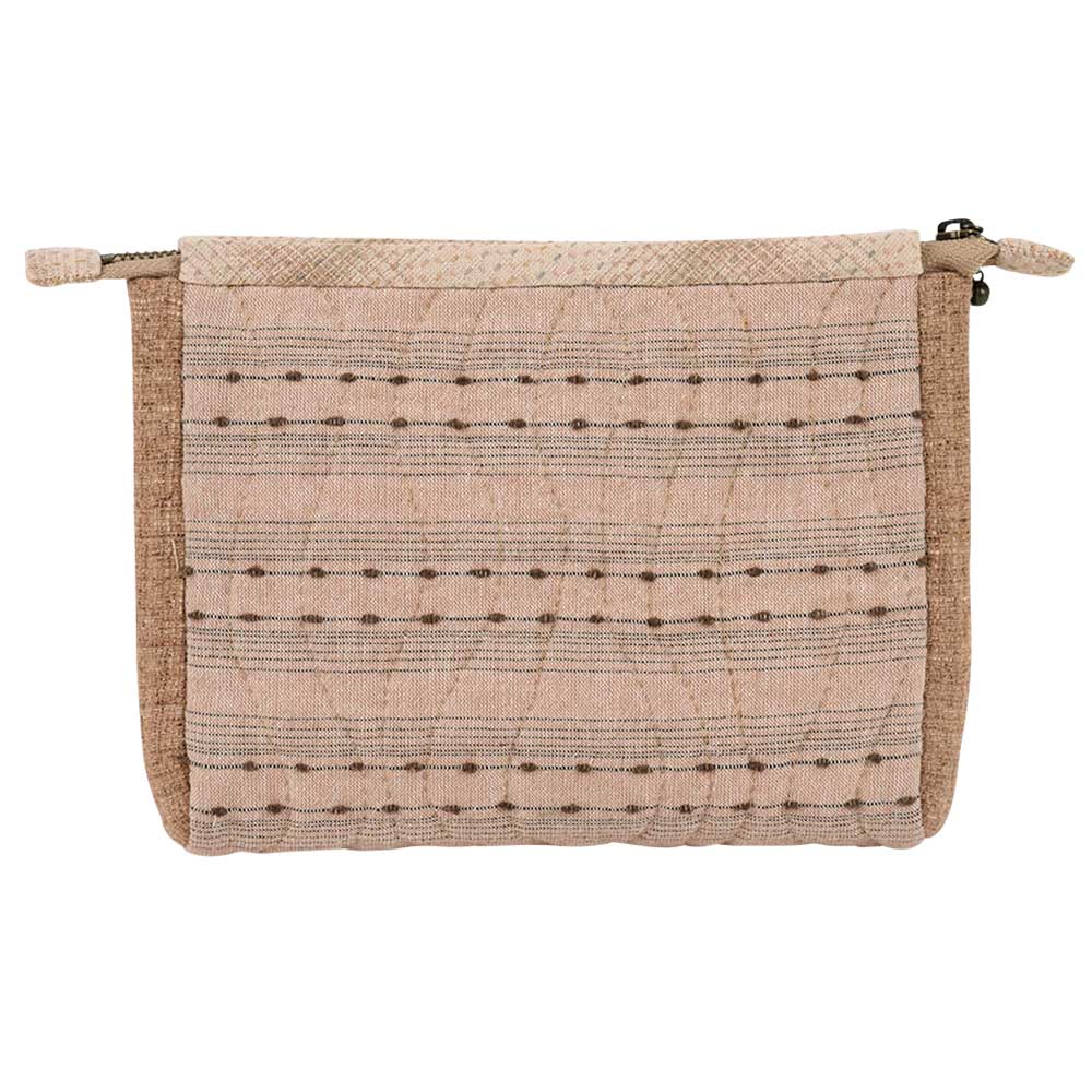 【キット作り方つき】エレガントなビオラの花をアップリケしたポーチです。ピースワークの土台は、赤やピンク系の先染め布にパープル系プリント布など10種の布を合わせます。