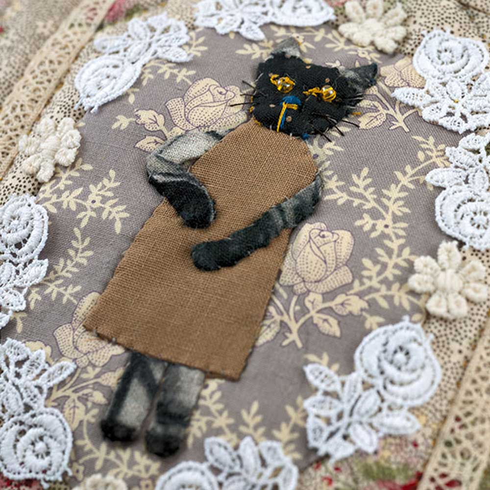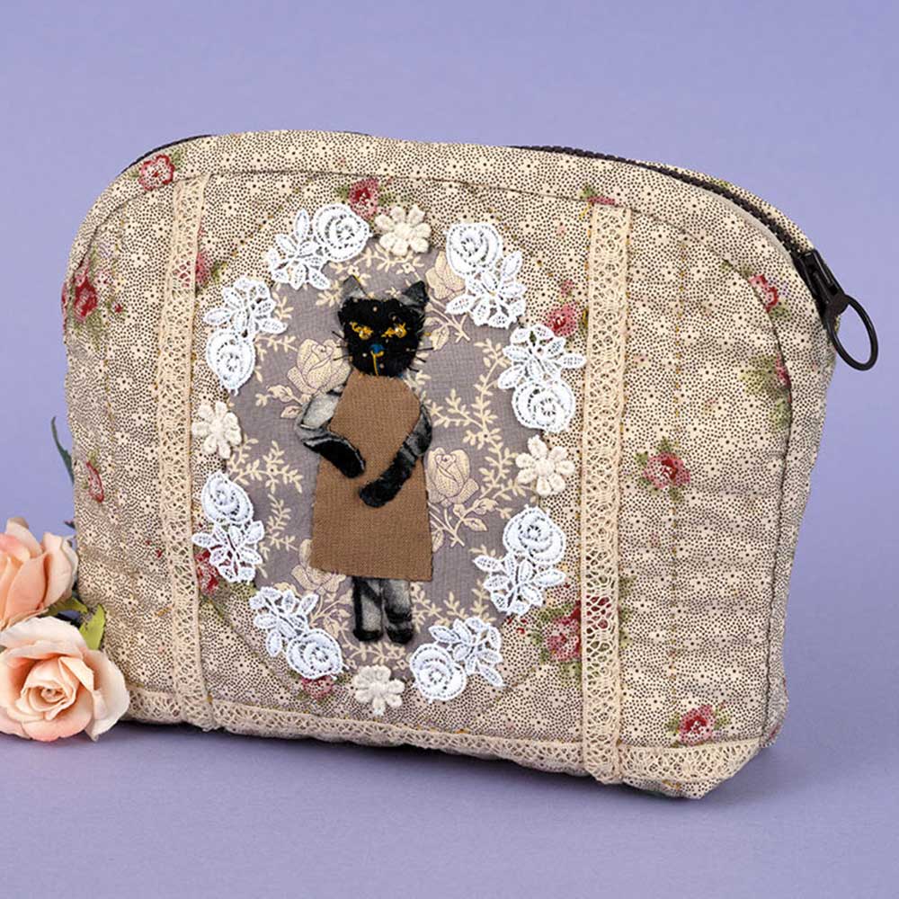 【キット作り方つき】きらっとした目で個性的な黒ネコはアップリケ済みでお届け。バラ柄プリントとレースでまとめたポーチ。