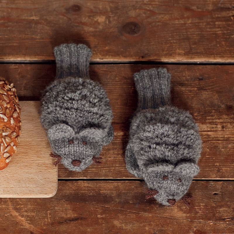 材料:ねずみ…ハマナカ ソノモノアルパカウール《並太》 ライトグレー(64)38gはりねずみ…ハマナカ ソノモノアルパカウール《並太》グレー(65)60g、ファーテープ用の別糸・とじ糸(グレー)少量、厚紙共通…顔の刺しゅう用並太毛糸(こげ茶)少量