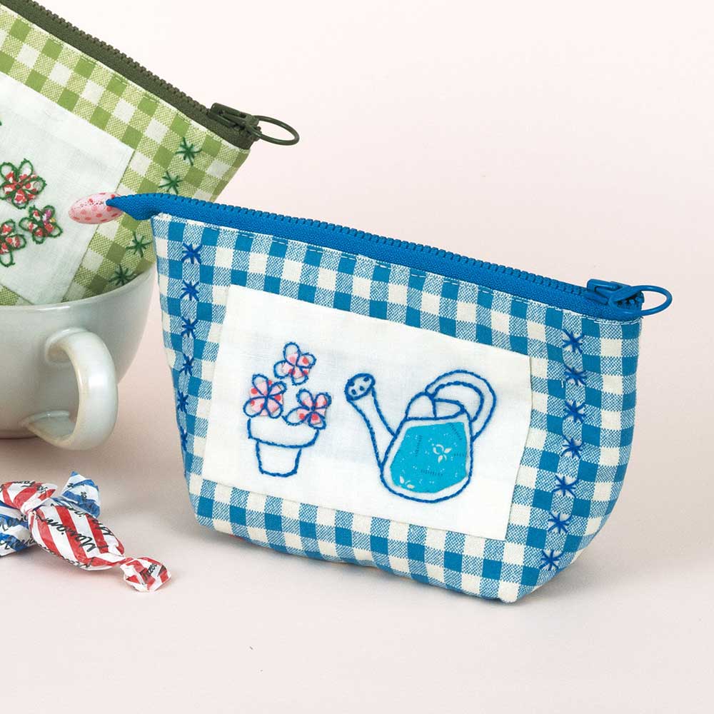 【キット作り方つき】チェックのベースに、それぞれアップリケと刺しゅうの可愛い柄をデザインしたポーチ4色です。仕立てが簡単なフリースタイルファスナーを使用します。