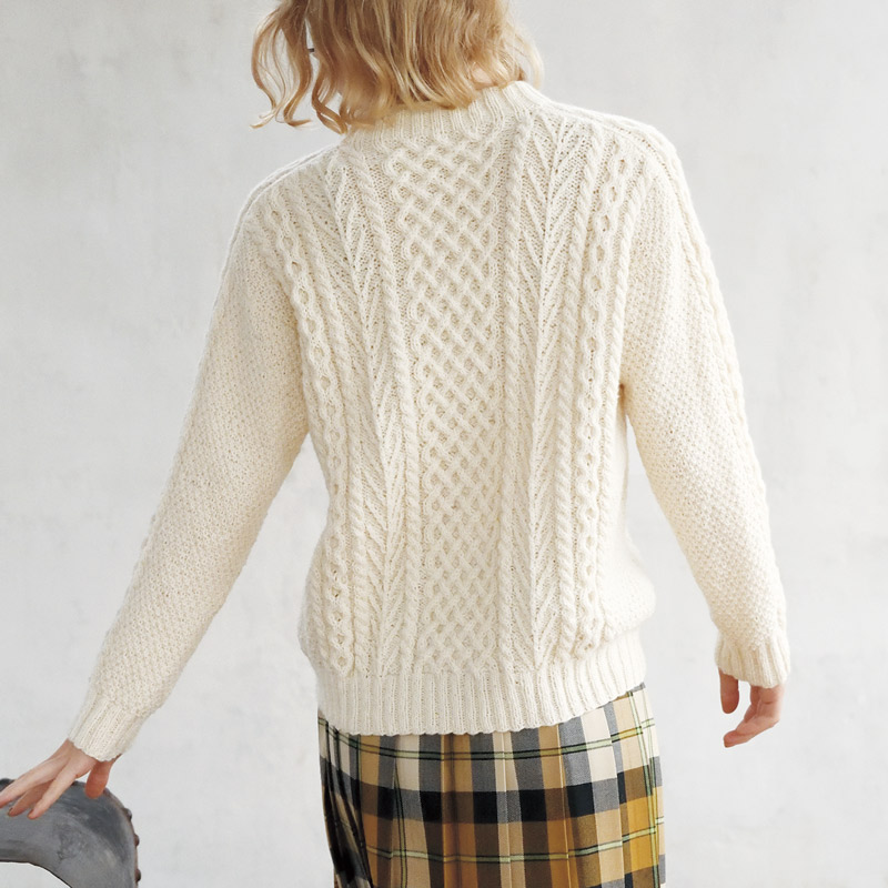 生成りのアランニットは永遠の憧れ。様々なケーブル模様と生命の木を組み合わせたベーシック模様が網羅された1枚で、今年のアラ活を始めましょう。エポーレットスリーブのデザインは肩の部分がふくらまず、すっきりときれいなラインで着られます。