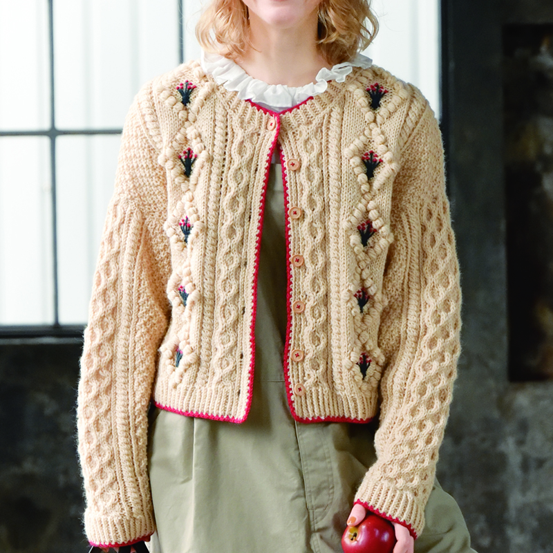 ボッブルで作るダイヤモンド柄に、刺繍を添えてクラフト感をアップ。コロコロとしたボッブルが額縁のように花束モチーフを引き立てます。細編みと鎖編みの色を効かせた縁取りも可愛らしいカーディガンです。