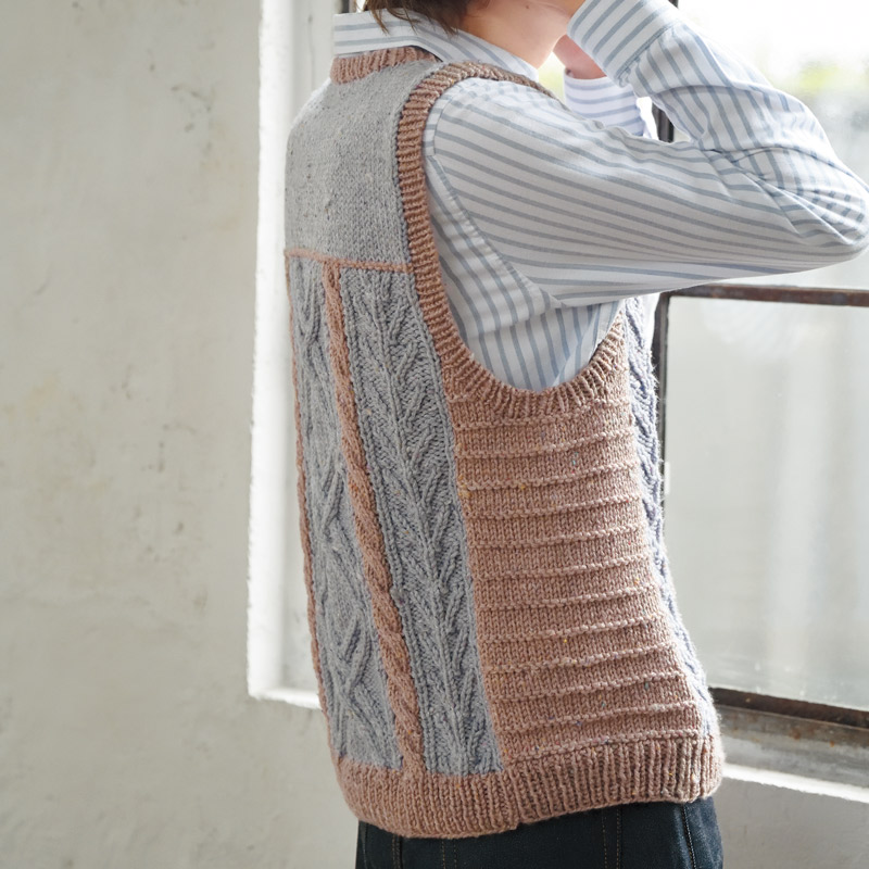 単色イメージのアラン模様をバイカラーで編んだデザインが新鮮なベスト。1枚着るだけでコーディネートのアクセントになる、抜群の存在感が魅力です。色違いで編んだり、単色で編んでも、素材を変えるのもありかも?と新しいヒントもくれる1着に。