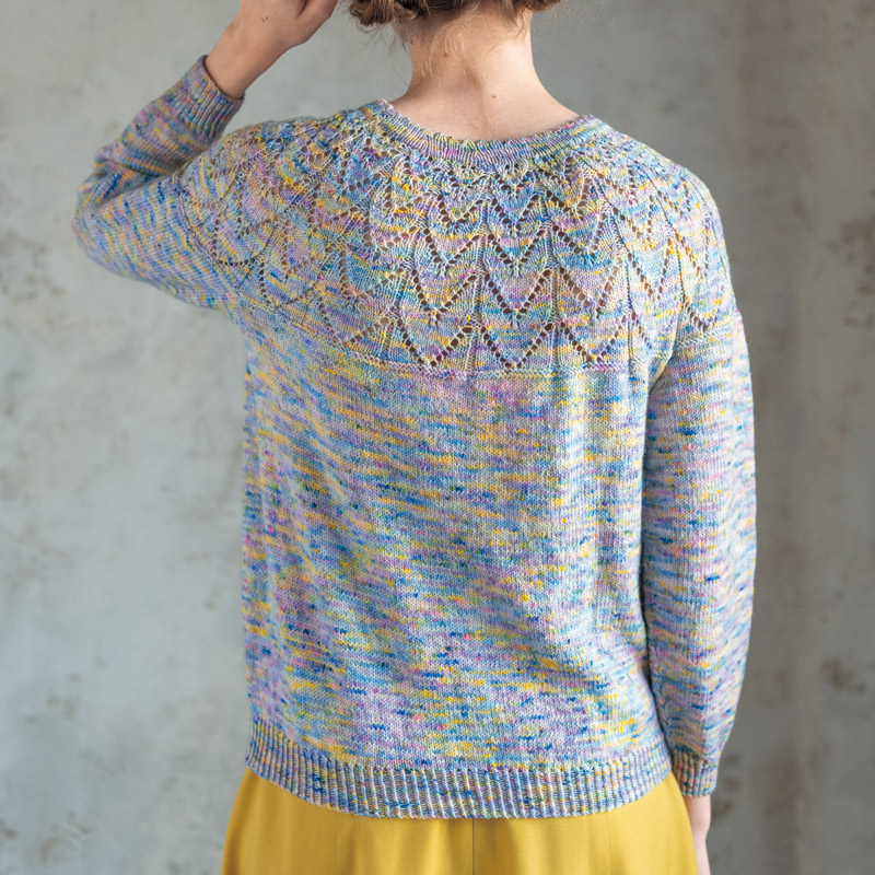 シルエットはオーソドックスに、丸ヨークに透かし模様を並べた使いやすい1着です。メリヤス編みパートも、色の移り変わりが楽しくてどんどん編み進められそう。最後に編む衿ぐりのピコットもかわいいデザインポイント。
