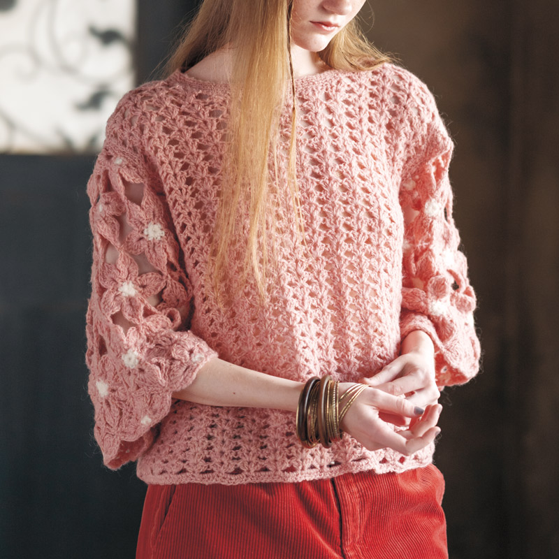 ベーシックな長編み模様のレーシーな身頃と花モチーフの袖のコラボレーションが絶妙なプルオーバー。やわらかな色合わせも相まって、キュートなデザインに大人女子の乙女心がときめきます。