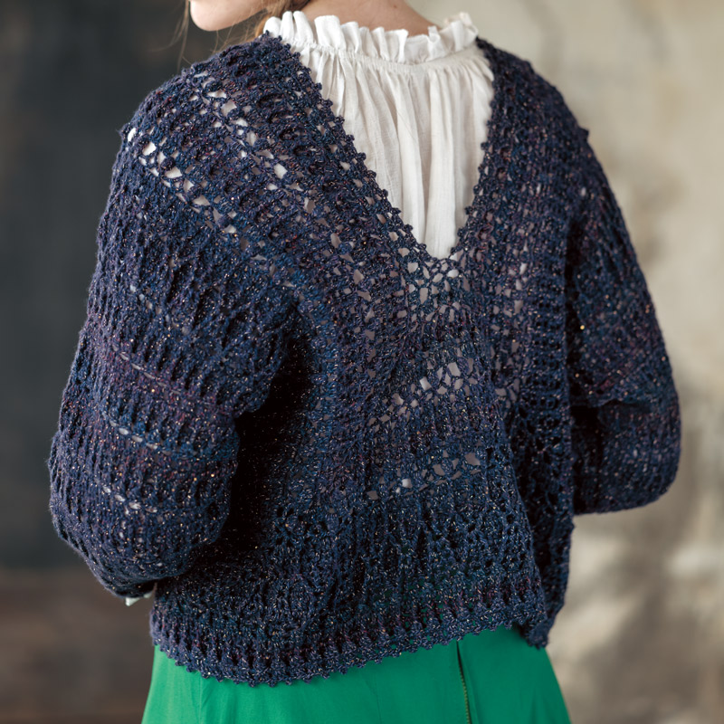 段染めヤーンのプルオーバーは、作り目を輪にし、まん中があいたモチーフを編むように前後身頃を続けてぐるぐると編み進みます。編み甲斐のある模様と極小のスパンコールが輝くグラデーションの相性も抜群!後ろのあきが気になる場合は、縁編みにひもやリボンを通して編み上げにしても。