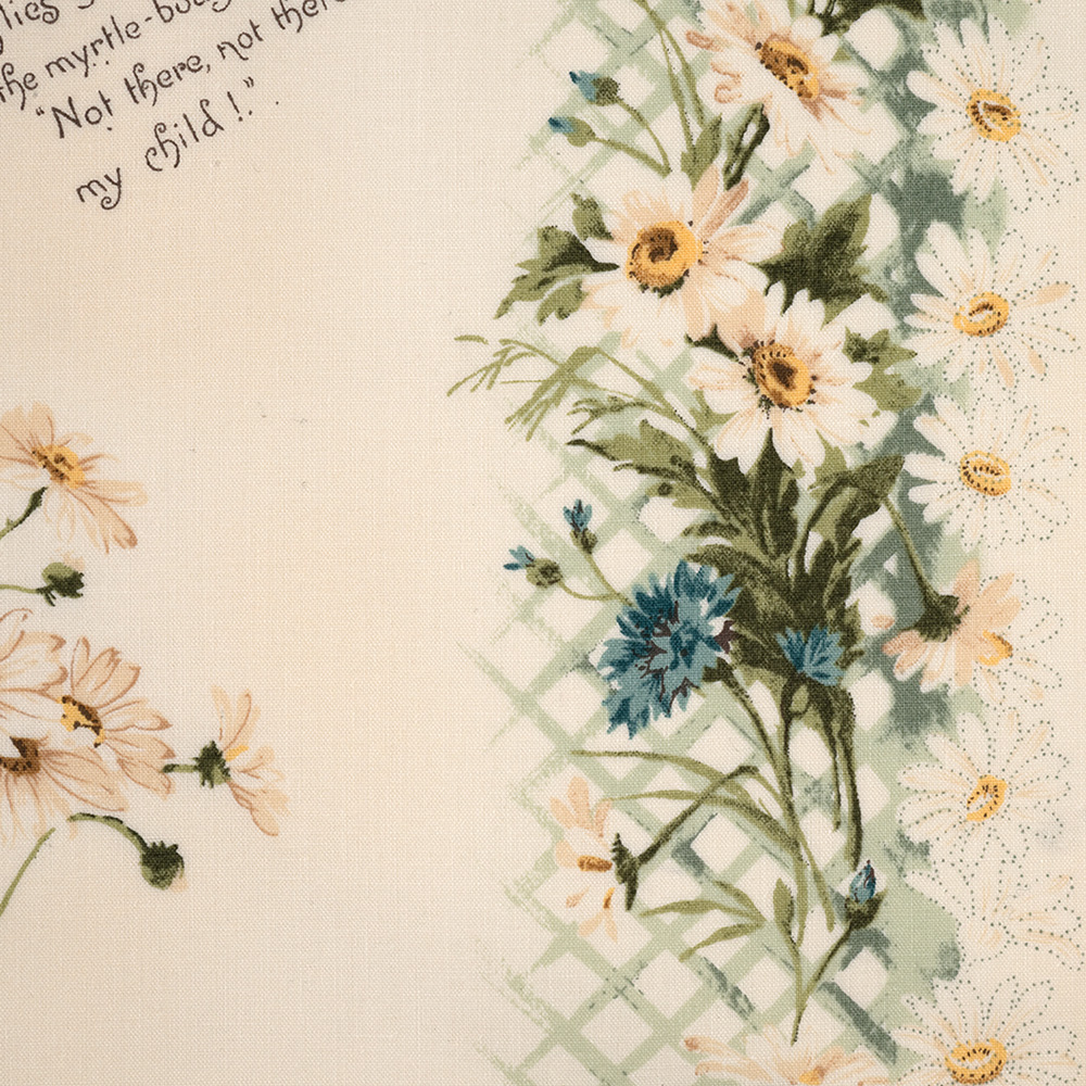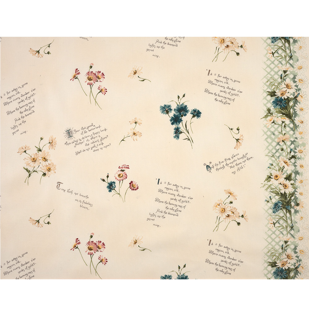 小関鈴子さんデザイン。両サイドにマーガレットとトレリスを描いた約8cm幅のボーダーが入ったエレガントで可愛らしいデザイン。タペストリーのボーダー使いや、インテリアなどにも。