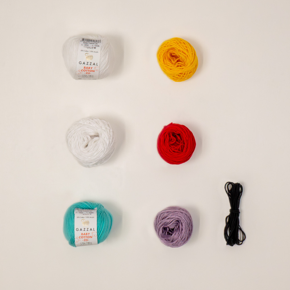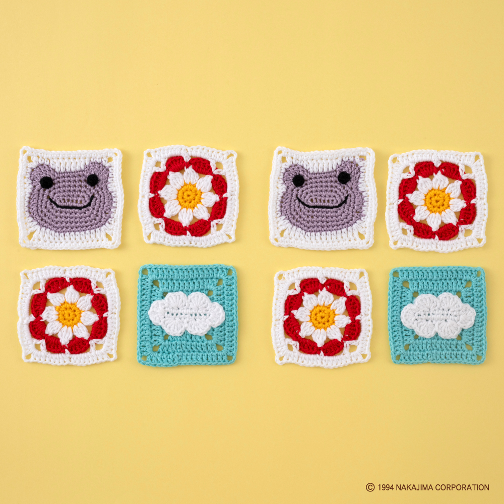 かぎ針編みモチーフが8枚編める材料と、小物を仕立てるための糸・レシピが付属します。