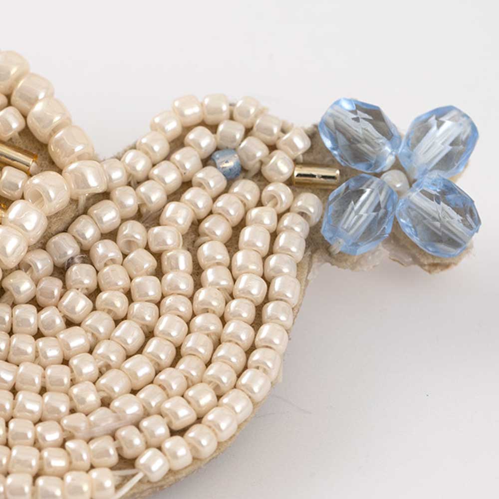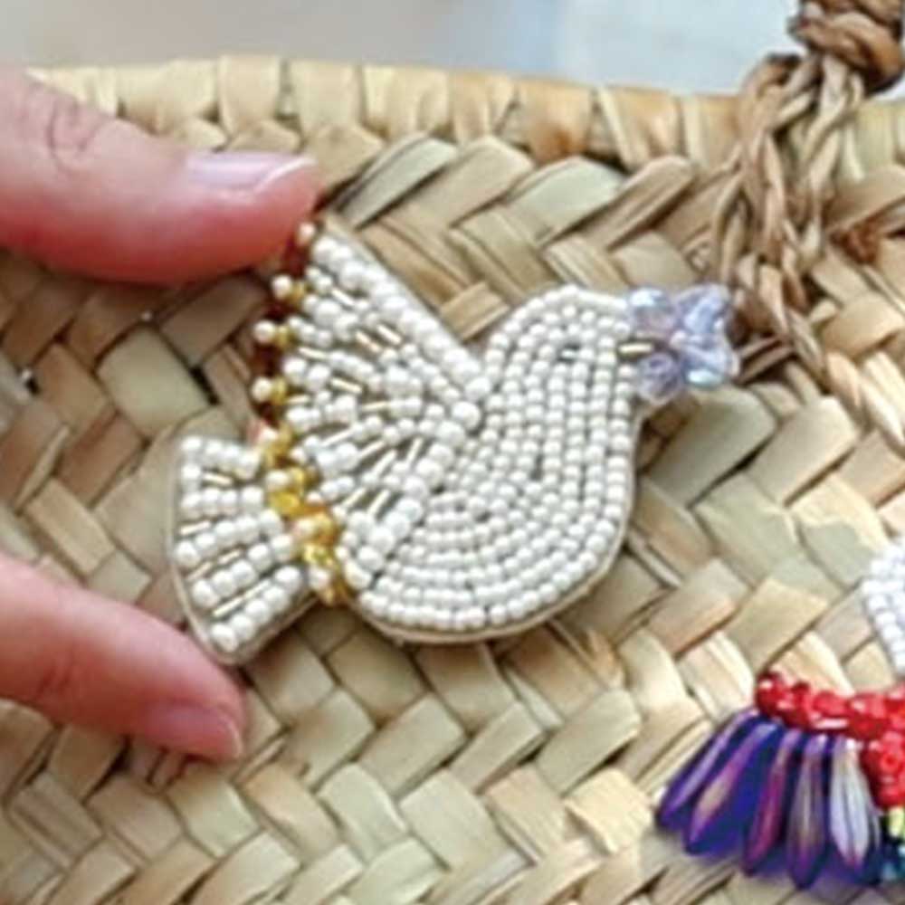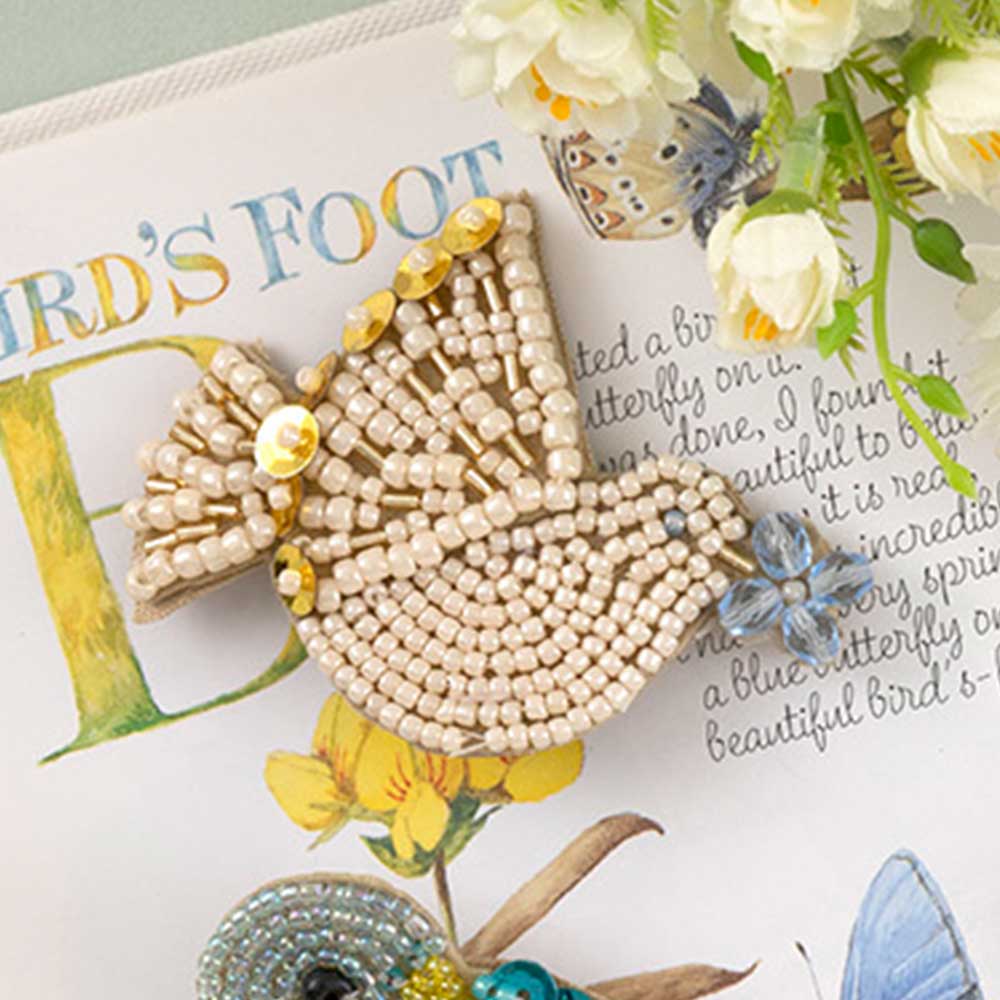 【キット作り方つき】 心躍るスパンコールや変形ビーズなども使い、身につけてお出かけするのが楽しくなる、鳥をモチーフにしたビーズ刺しゅうのブローチです。作り方のポイントが動画で見れるQRコードがレシピについているので、ビーズ刺しゅう初心者の方でも安心です。四つ葉のクローバーを届ける「鳩」です。