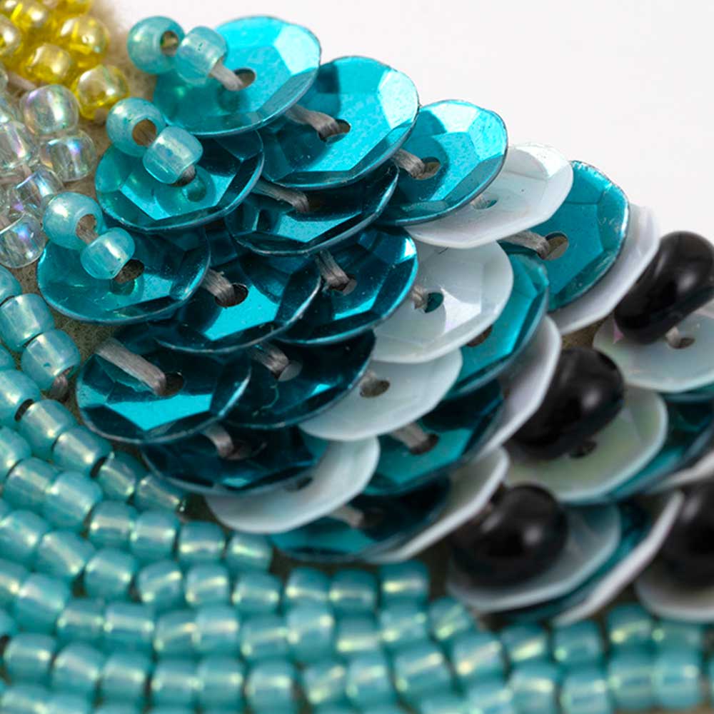 【キット作り方つき】 心躍るスパンコールや変形ビーズなども使い、身につけてお出かけするのが楽しくなる、鳥をモチーフにしたビーズ刺しゅうのブローチです。作り方のポイントが動画で見れるQRコードがレシピについているので、ビーズ刺しゅう初心者の方でも安心です。本当はおしゃべりな「セキセイインコ」です。