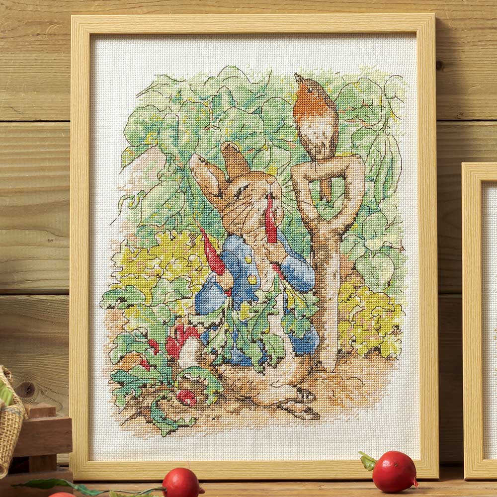 【キット作り方つき】【フレームつき】 マグレガーさんの畑でラディッシュをこっそりかじるピーターラビット?を描いたシリーズ第1巻の有名なシーン。原画の繊細なタッチを、クロスステッチとバックステッチでリアルに表現。。中~上級の方向け。
