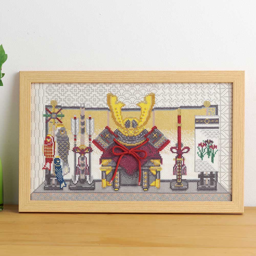 【キット作り方つき】【フレームつき】 背景に伝統柄を配置したデザインです。豪華な屏風の前にある兜の緒はクロスステッチをした後に紐を結び縫い付けます。中級の方向け。