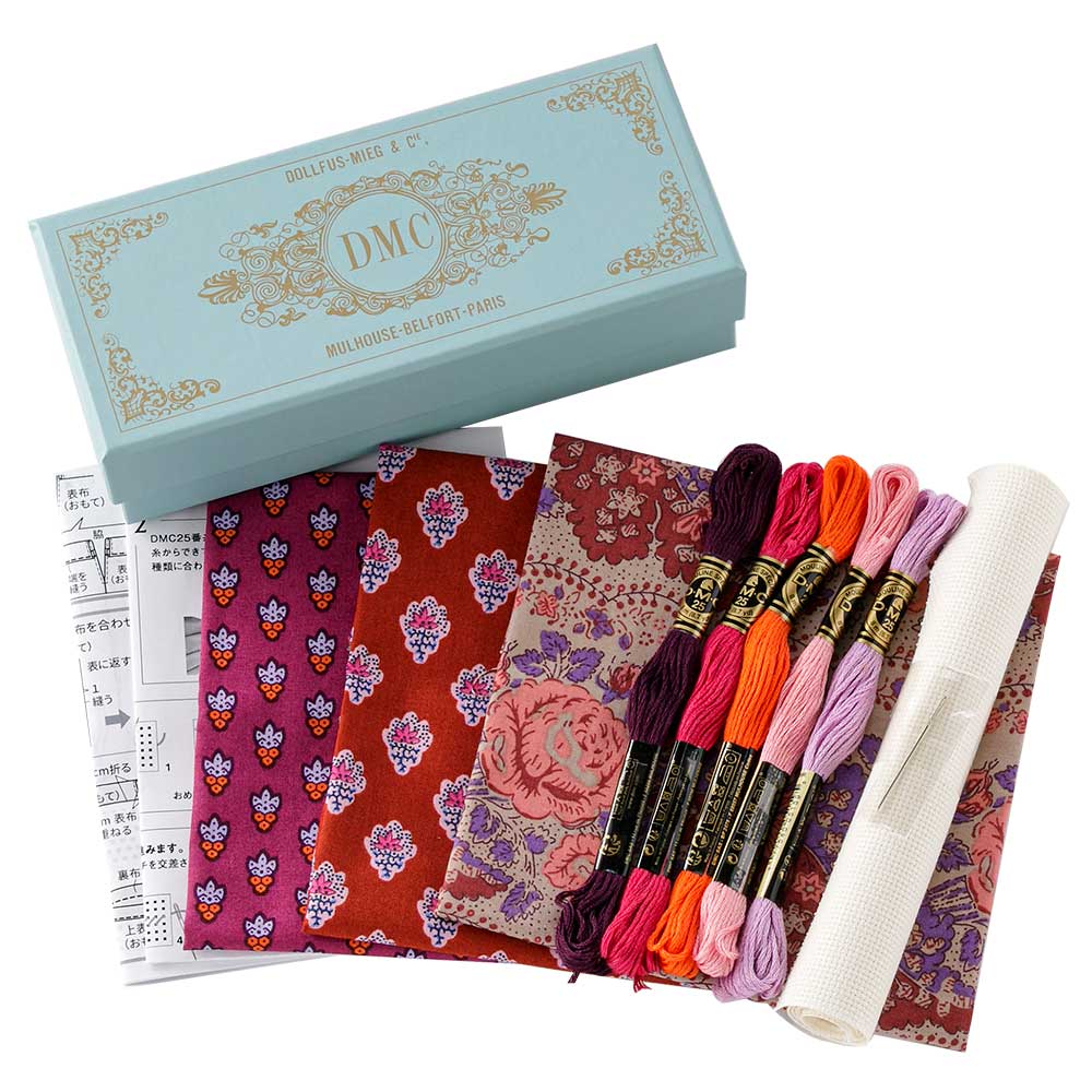 【キット作り方つき】ソレイアードとフランスの刺しゅうメーカー・DMCのコラボレーションキット。ソレイアードを代表する3種の小紋柄をクロスステッチして、ソレイアードのカットクロスと合わせて、ポーチやミニバッグに仕立てることができます。6つのアイテムから1~2点を選んで作ることができる分量が入っています。DMCのヴィンテージ風ボックスに入れてお届けします。