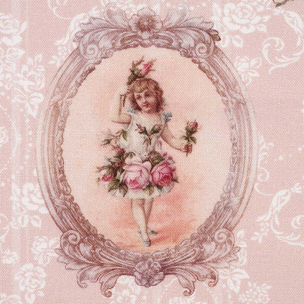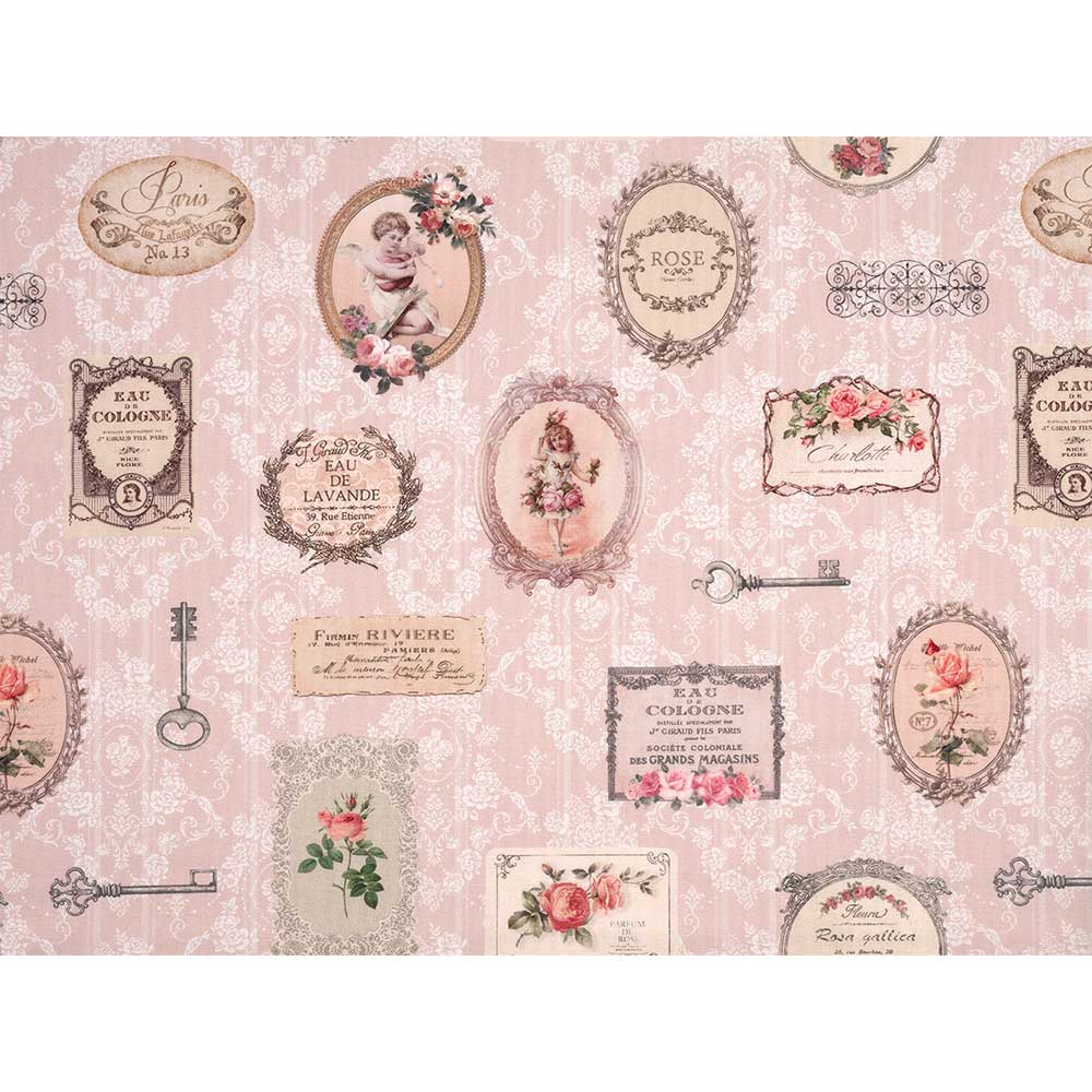 人気の柄を、少しだけ柄を小さくリサイズして、使いやすくしたリバイバルプリント。ゴブラン織りのようなゴージャスな地紋の上に、ロココ調の天使柄やクラシックラベルなどを配置しました。