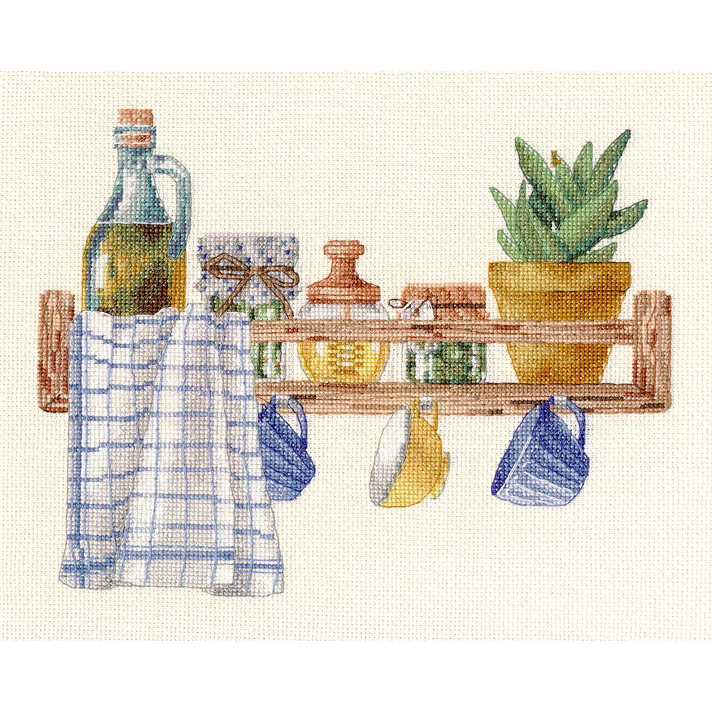 【キット作り方つき】ウォールシェルフは小さなコレクションスペース。おしゃれなキッチンアイテムを描いた、簡単なステッチで仕上げるクロスステッチ作品です。中級の方向き。ロシア・OBEN社製。