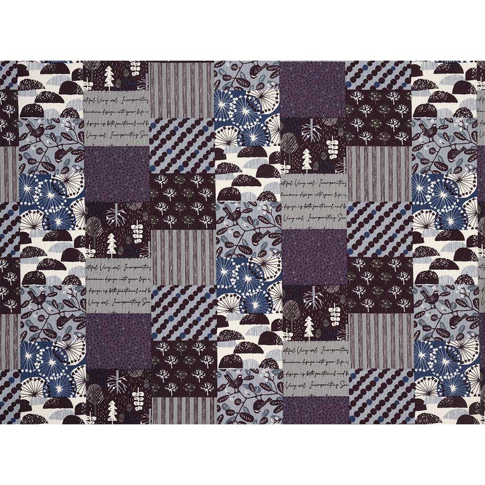 文字や植物、幾何学模様などを描いた約4×4.8cmのブロックをつないだようなプリント布です。落ち着いた赤みの強いパープルがシックでおしゃれ。ブロックに合わせて縫えば、キルト風に仕上がります。