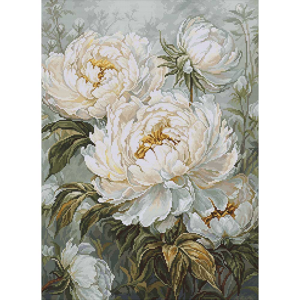 【キット作り方つき】 大輪のホワイトピオニーを繊細に描いた、シックで上品なクロスステッチ作品です。上級の方向け。モルドバ・Luca-S社製。
