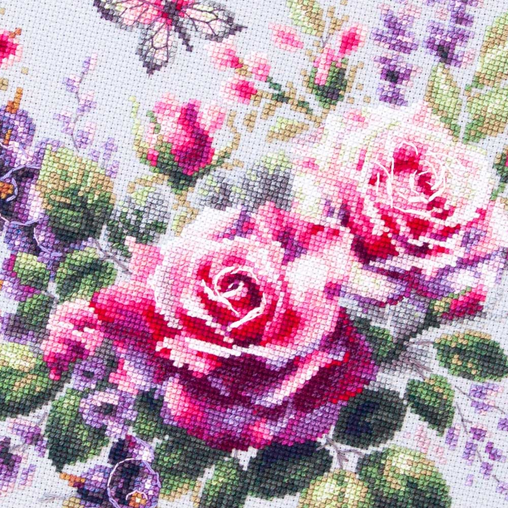 【キット作り方つき】 シルバーグレーのアイーダに、ピンクとパープルの花や実のハーモニーが美しいクロスステッチ作品です。中~上級の方向け。ラトビア・Magic needle社製(マジックニードル)。