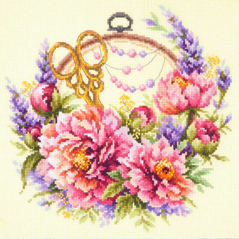【キット作り方つき】 華やかなピオニーとハサミ、刺しゅう枠を描いたエレガントなクロスステッチ作品です。中~上級の方向け。ラトビア・Magic needle社製(マジックニードル)。