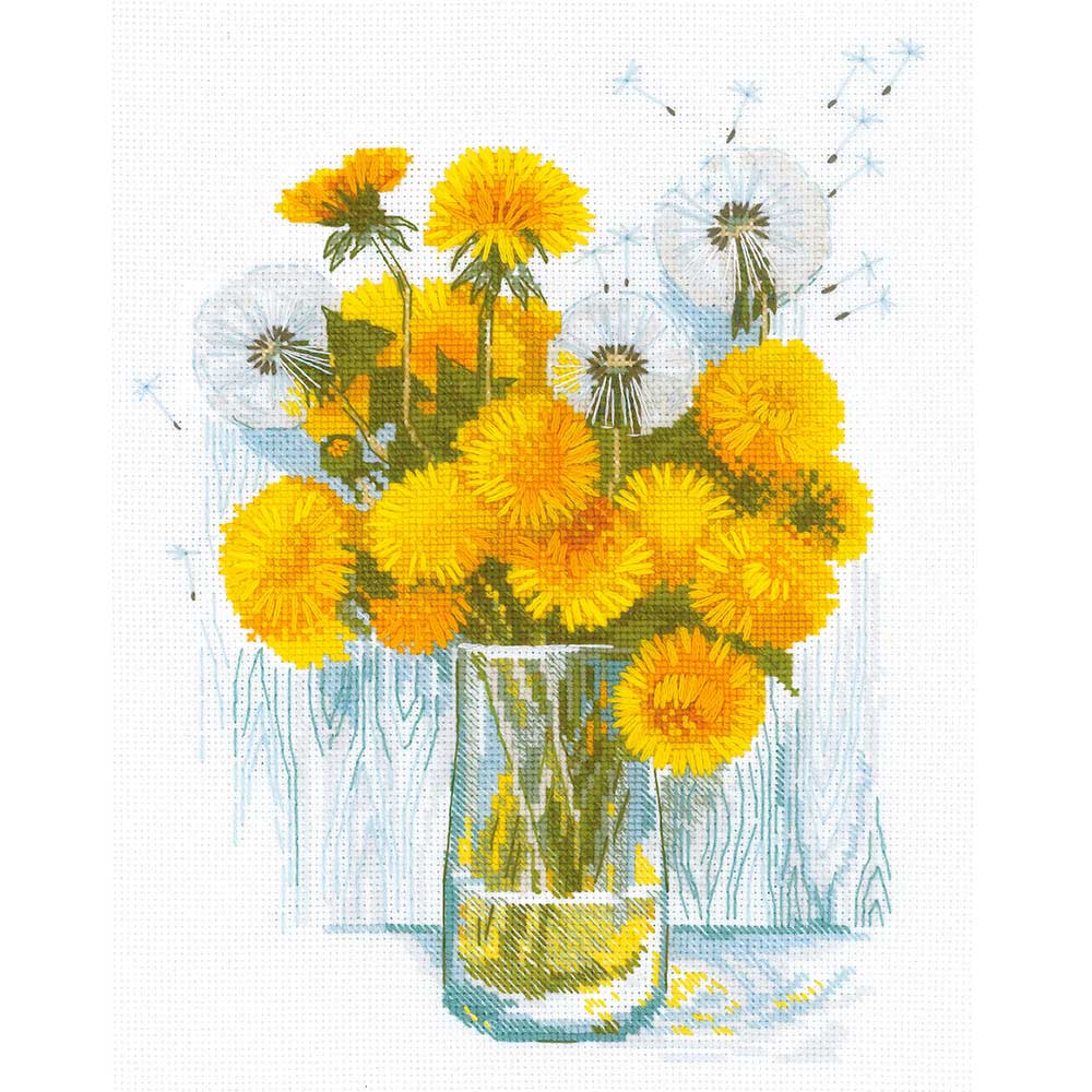 【キット作り方つき】 新鮮な黄色いタンポポでいっぱいの花瓶を描いたクロスステッチ作品。柔らかな白い綿毛が花束の周りに優しく漂い、軽やかで風通しの良い雰囲気をシーンに添えています。上級の方向け。リトアニア・RIOLIS社製。